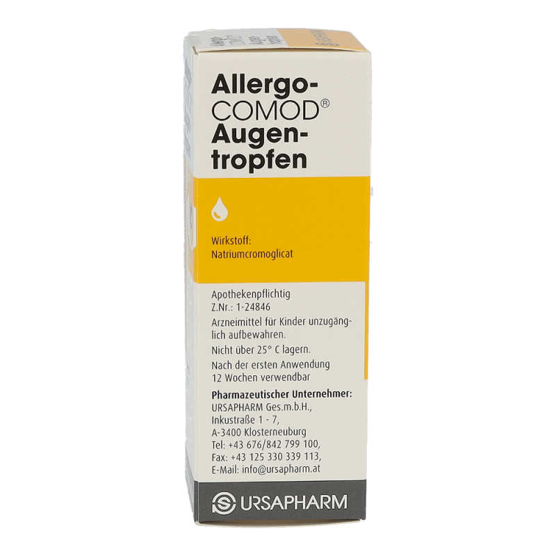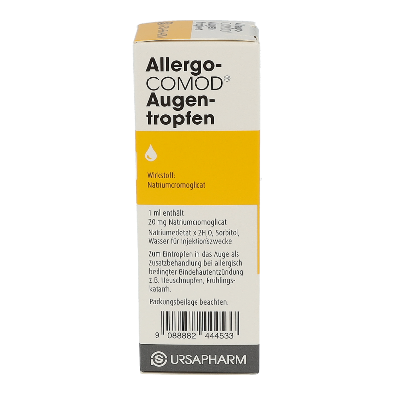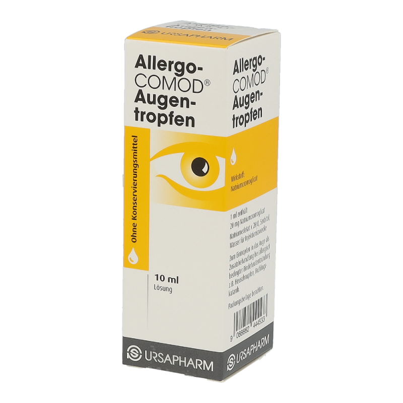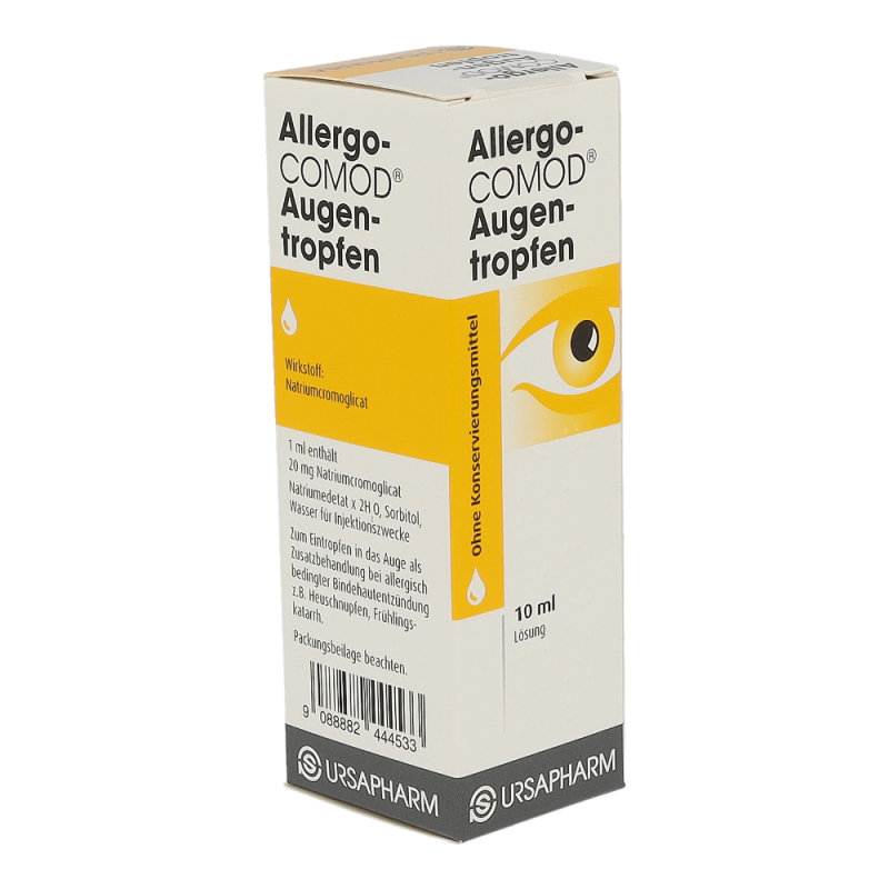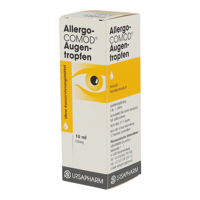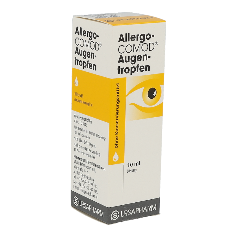 Der Wirkstoff ist Natriumcromoglicat 20 mg/ml.Die sonstigen Bestandteile sind Natriumedetat x 2 H2O, Sorbitol, Wasser für Injektionszwecke1 ml = 30 TropfenHinweis: Allergo-COMOD® Augentropfen enthalten kein Konservierungsmittel. Allergo-COMOD® Augentropfen ist eine klare, farblose bis leicht gelb gefärbte Lösung, die in einem Mehrdosenbehältnis mit gasfreiem Pumpsystem abgefüllt ist. Jede Packung enthält 1 Behältnis mit 10 ml Lösung.