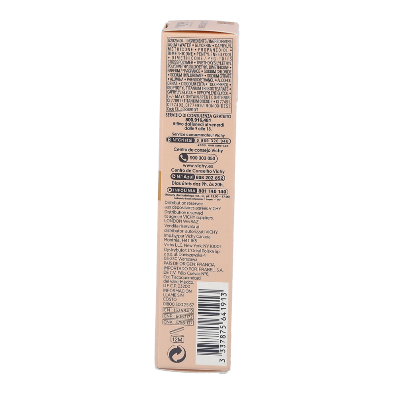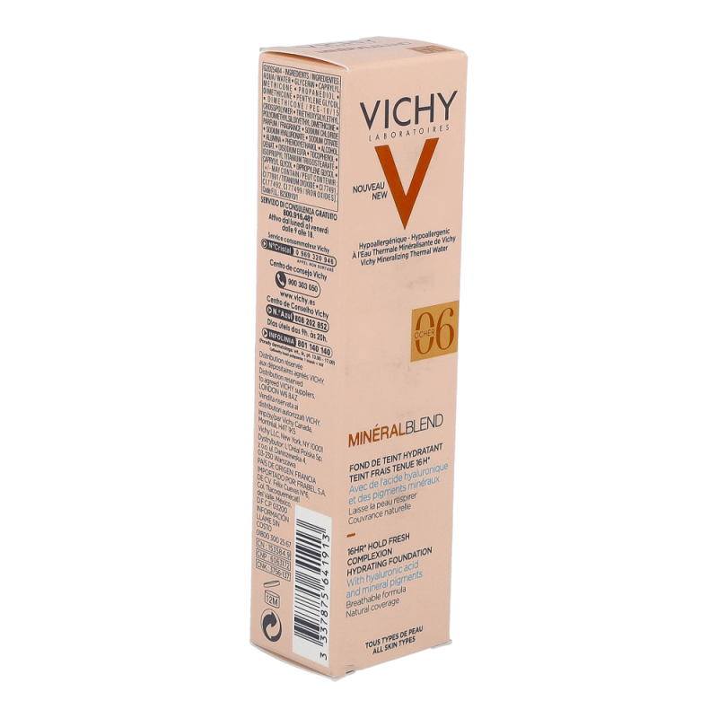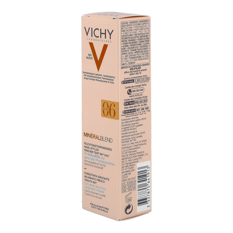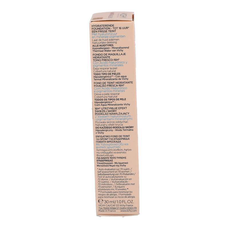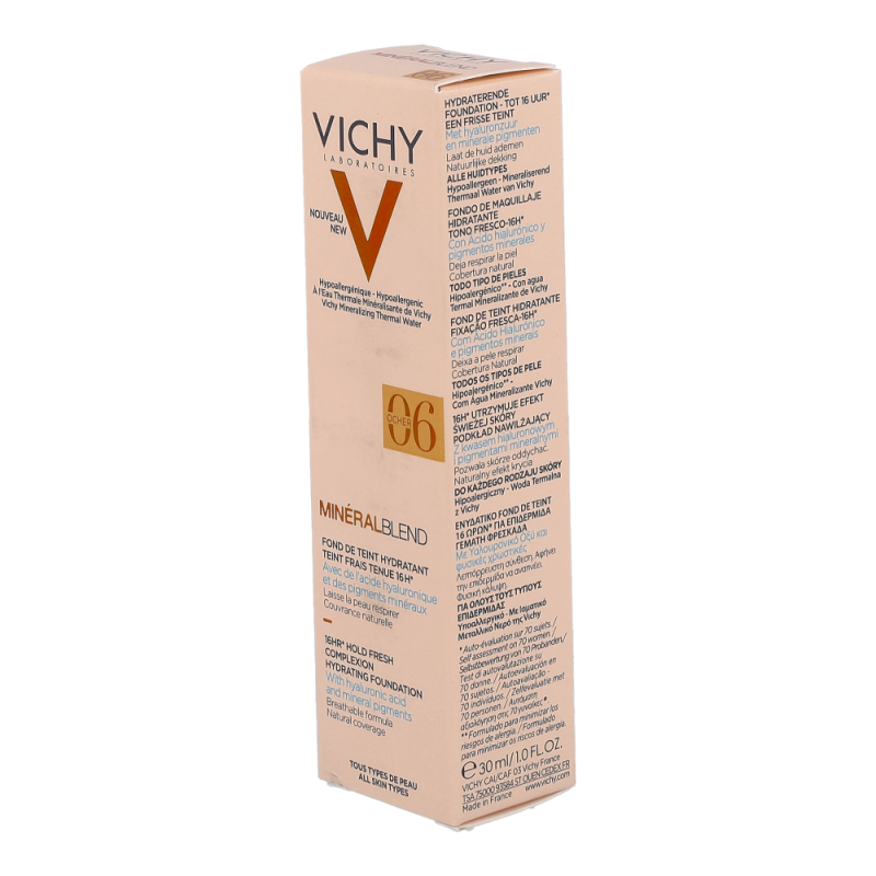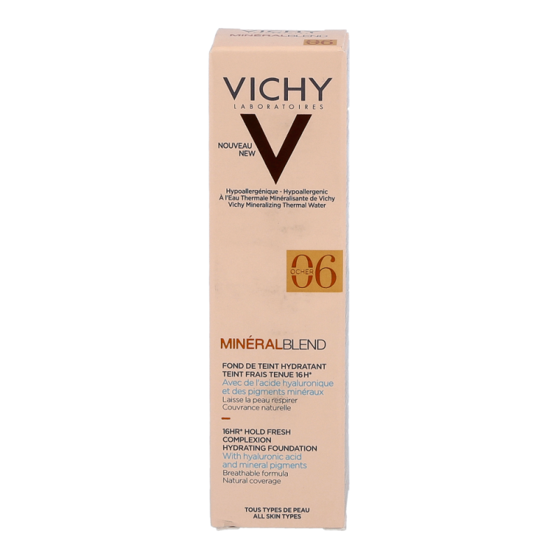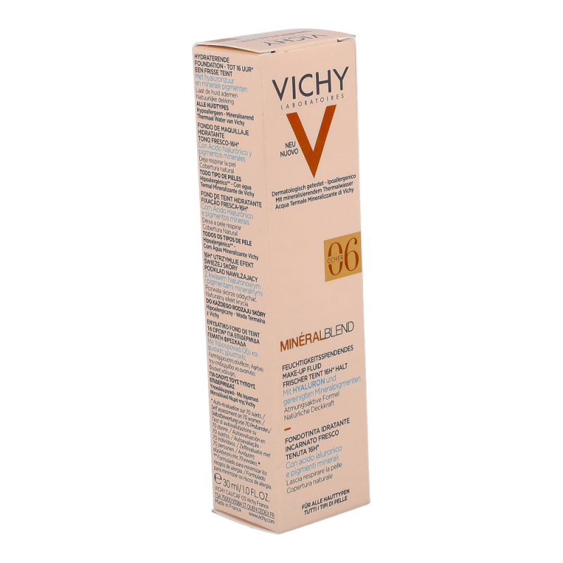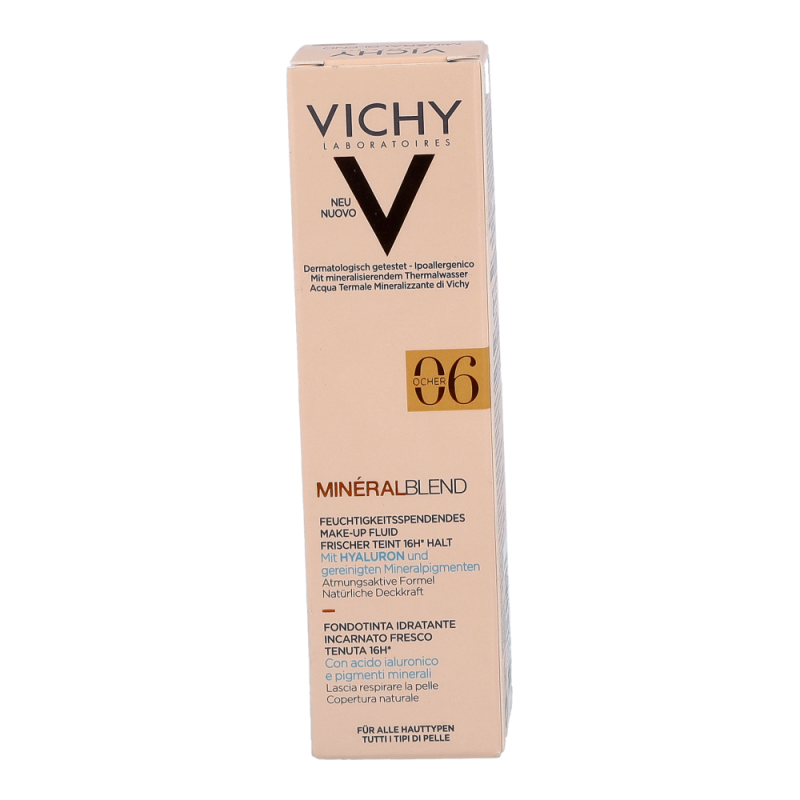VICHY Mineralblend Fluid 06 Ocher ist ein ultra-leichtes Make-up-Fluid mit Hyaluron. Feuchtigkeitsspendend wie eine Pflege. Die atmungsaktive Minéralblend-Formel enthält Aktiv-Wirkstoffe wie natürliches Hyaluron, gereinigte Mineralpigmente und Vulkanischem Wasser von Vichy, die die Haut sofort mit Feuchtigkeit versorgen und pflegen. Die Make-up Textur verschmilzt beim Auftragen sofort mit der Haut. Dabei ist das Make-up Fluid atmungsaktiv und schenkt 16 Stunden lang einen natürlich, strahlenden Teint. Tag für Tag wirkt die Haut so frischer. Für ein natürlich strahlendes Ergebnis