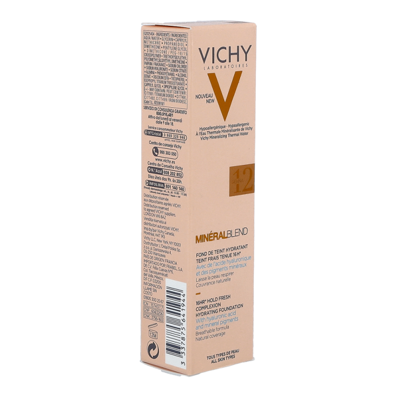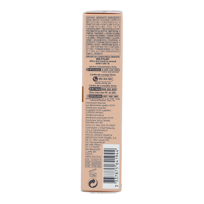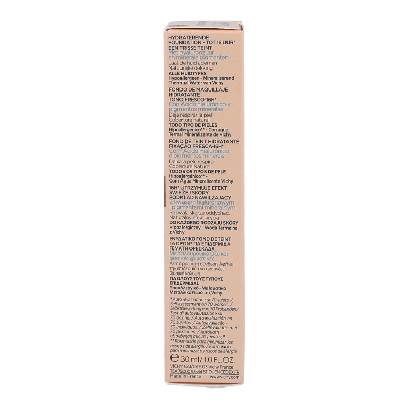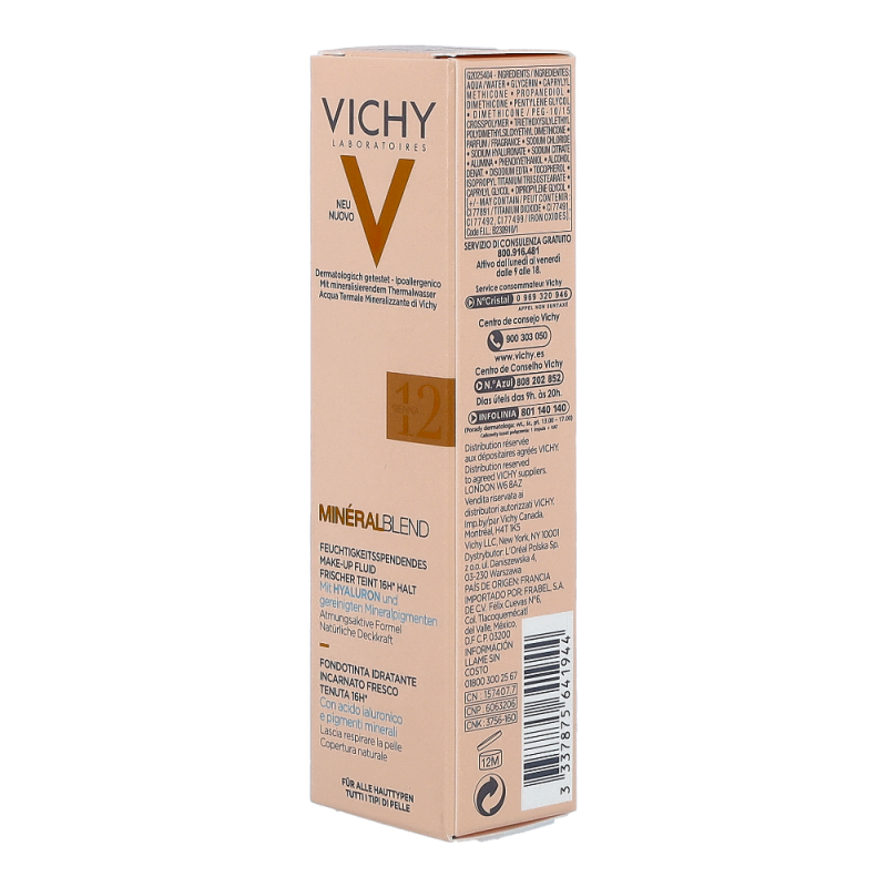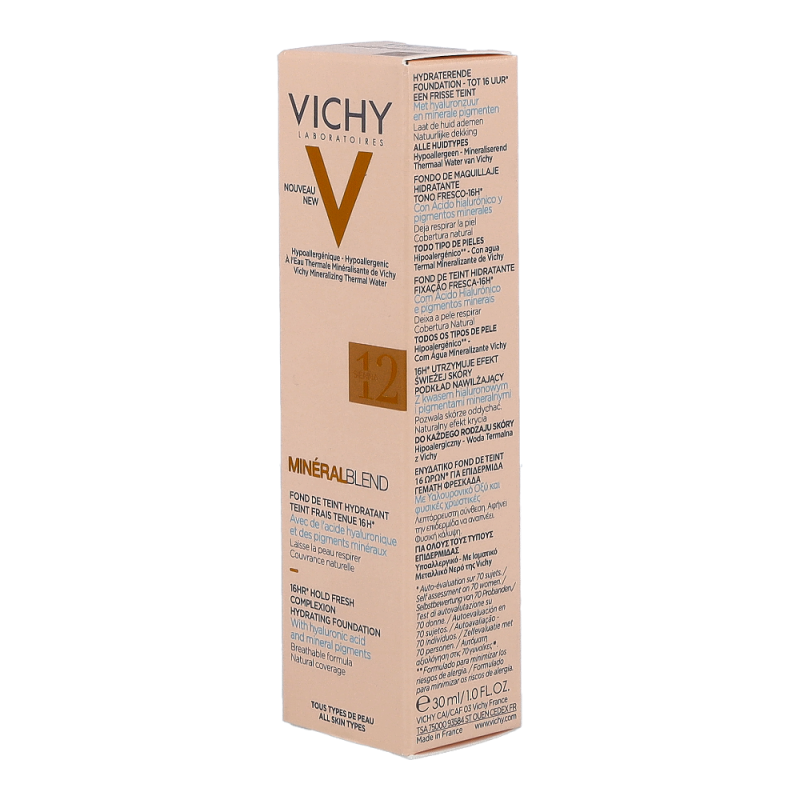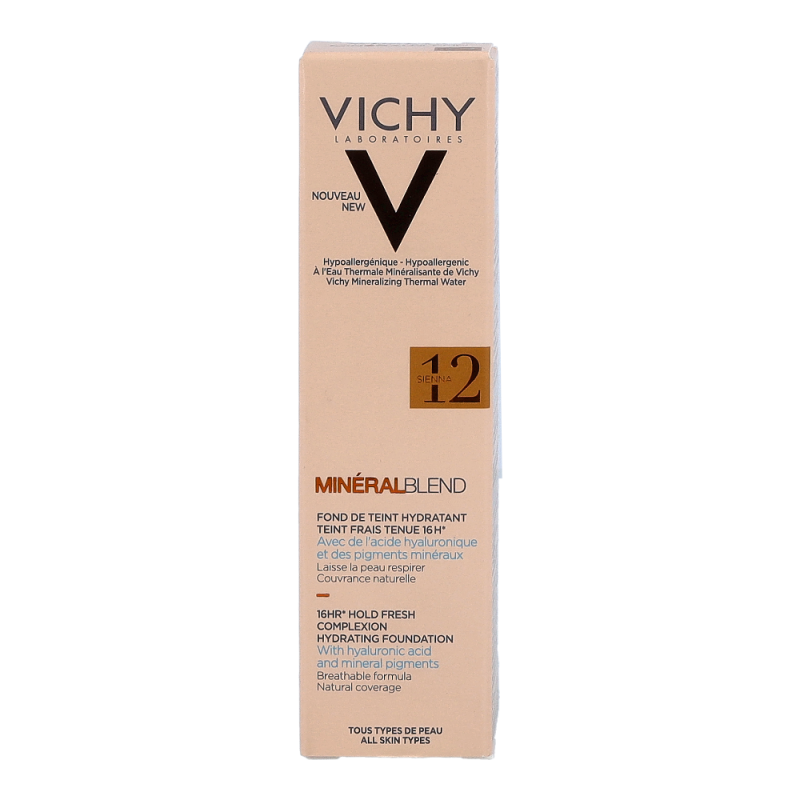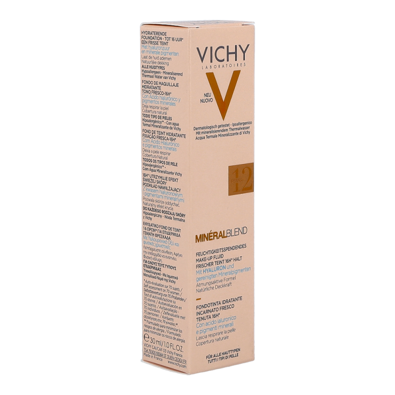 VICHY Mineralblend Fluid 12 Sienna ist ein ultra-leichtes Make-up-Fluid mit Hyaluron. Feuchtigkeitsspendend wie eine Pflege. Die atmungsaktive Minéralblend-Formel enthält Aktiv-Wirkstoffe wie natürliches Hyaluron, gereinigte Mineralpigmente und Vulkanischem Wasser von Vichy, die die Haut sofort mit Feuchtigkeit versorgen und pflegen. Die Make-up Textur verschmilzt beim Auftragen sofort mit der Haut. Dabei ist das Make-up Fluid atmungsaktiv und schenkt 16 Stunden lang einen natürlich, strahlenden Teint. Tag für Tag wirkt die Haut so frischer. Für ein natürlich strahlendes Ergebnis
