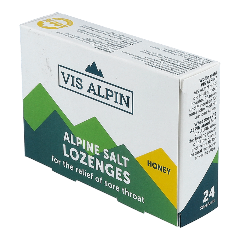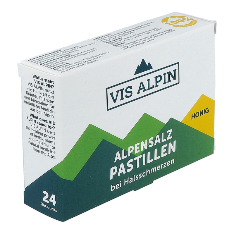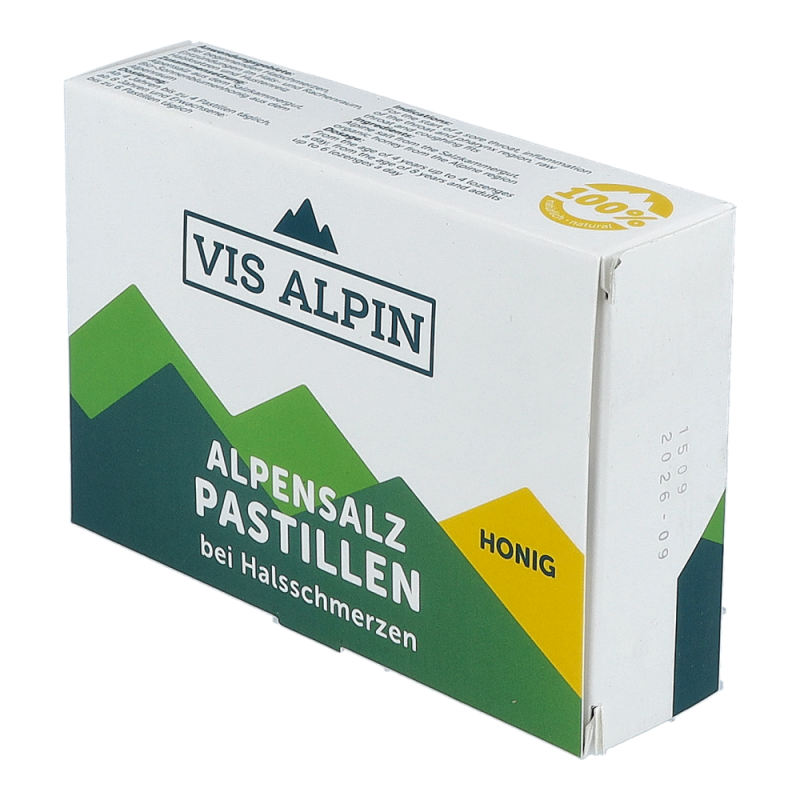 Vis Alpin Alpensalzpastillen Honig kombinieren wertvolle Bestandteile aus Pflanzen, Kräutern und Mineralien aus den Alpen mit modernster Medizin. Die Pastillen befeuchten Mund- und Rachenschleimhaut, lindern damit verbundene Heiserkeit, Halskratzen und Reizhusten sowie beginnende Halsschmerzen und schaffen auch Abhilfe bei Raucherkatarrh oder anderen Belastungen, die mit einer Austrocknung der Rachenschleimhaut einhergehen können. Durch die spezielle Zusammensetzung wird auf der Rachenschleimhaut ein Schutzfilm gebildet und somit eine optimale Barriere gegen Viren und Bakterien geschaffen – jetzt online vorbestellen und so die Vorteile einer Onlineapotheke nutzen mit der Sicherheit einer Standortapotheke!