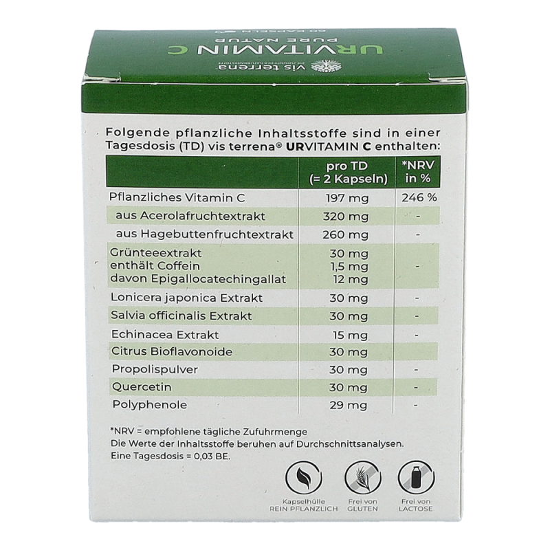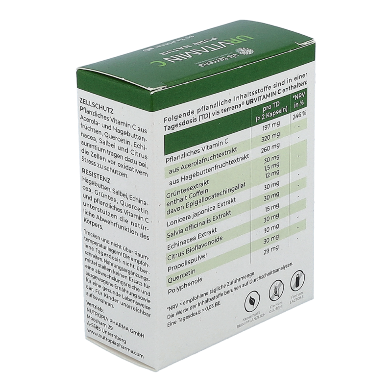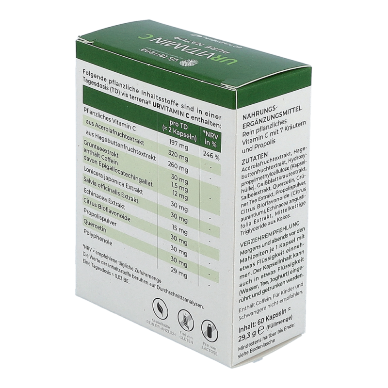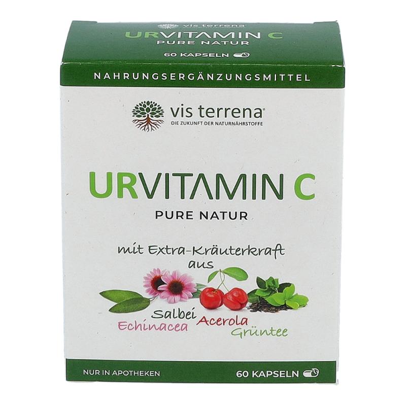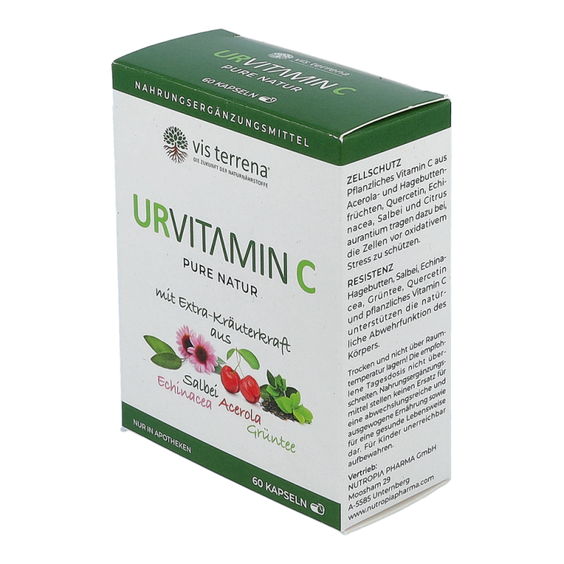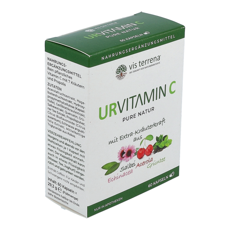 Vis terrena Urvitamin C Kapseln Kapseln ist ein Nahrungsergänzungsmittel, welches den Körper durch hochwertige sekundäre Pflanzenstoffe bei seiner Abwehrfunktion unterstützt. Es enthält pflanzliches Vitamin C aus Acerola- und Hagebuttenfrüchten, Quercentin, Grüntee, Salbei und Citrus aurantium um die Zellen vor oxidativem Stress zu schützen und das Immunsystem zu stärken.