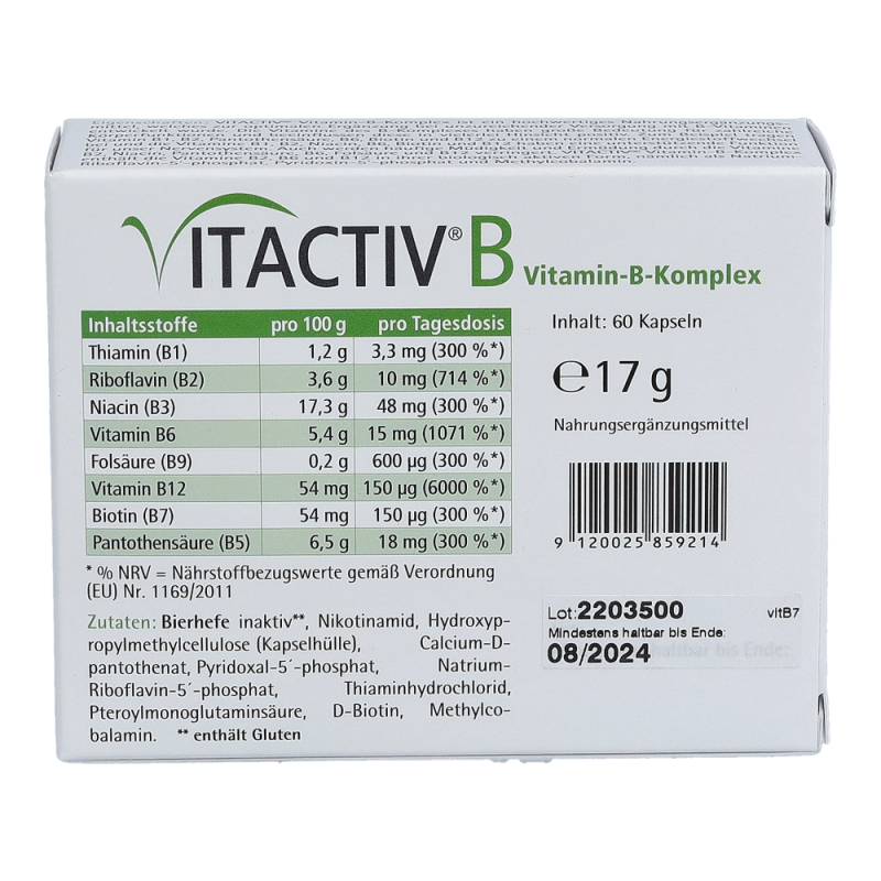 Vitactiv B Vitamin-B-Komplex dient zur optimalen Versorgung mit B-Vitaminen. Der Kamplex enthält die Vitamine B1, Folsäure, Biotin und Pantothensäure sowie B2, Niacin, B6 und b12 in ihrer biologisch aktiven Form. Die Vitamine des B-Komplexes haben große Bedeutung für zahlreiche Körperfunktionen und beeinflussen diese in vielerlei Hinsicht positiv. Jetzt bestellen und je 1 Tagesportion Orthomol Immun gratis erhalten!