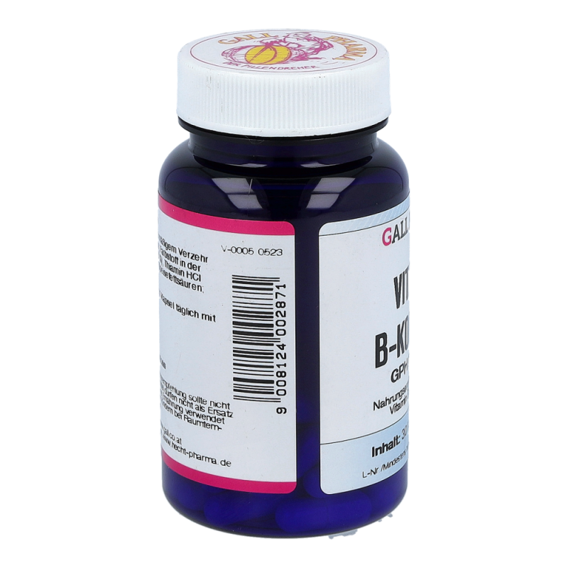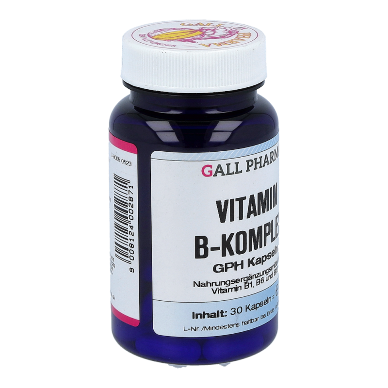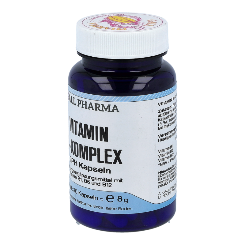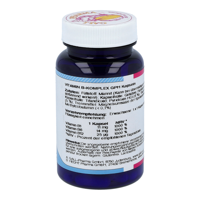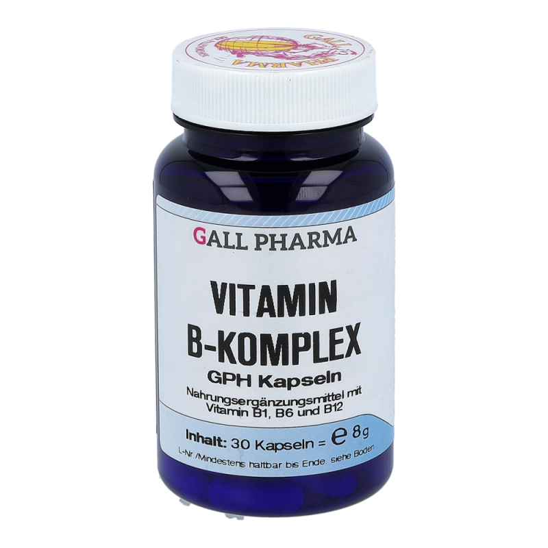 Gall Pharma Vitamin B-Komplex Kapseln enthalten 0,46 mg Vitamin B1, 0,66 mg Vitamin B6 und 1 µg Vitamin B12 in einer Hartgelatinekapsel. Die B-Vitamine spielen eine wichtige Rolle für das Nervensystem, die Energiebereitstellung und die Konzentrationsfähigkeit.Jetzt bestellen und je 1 Tagesportion Orthomol Immun gratis erhalten!