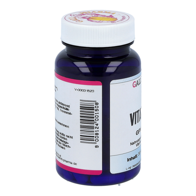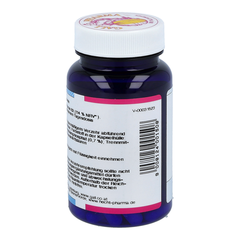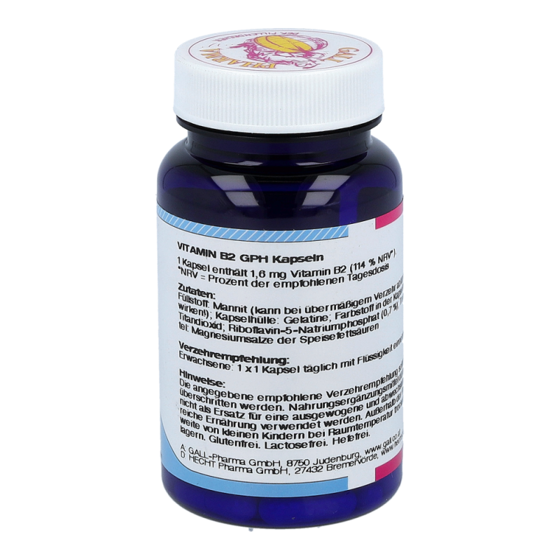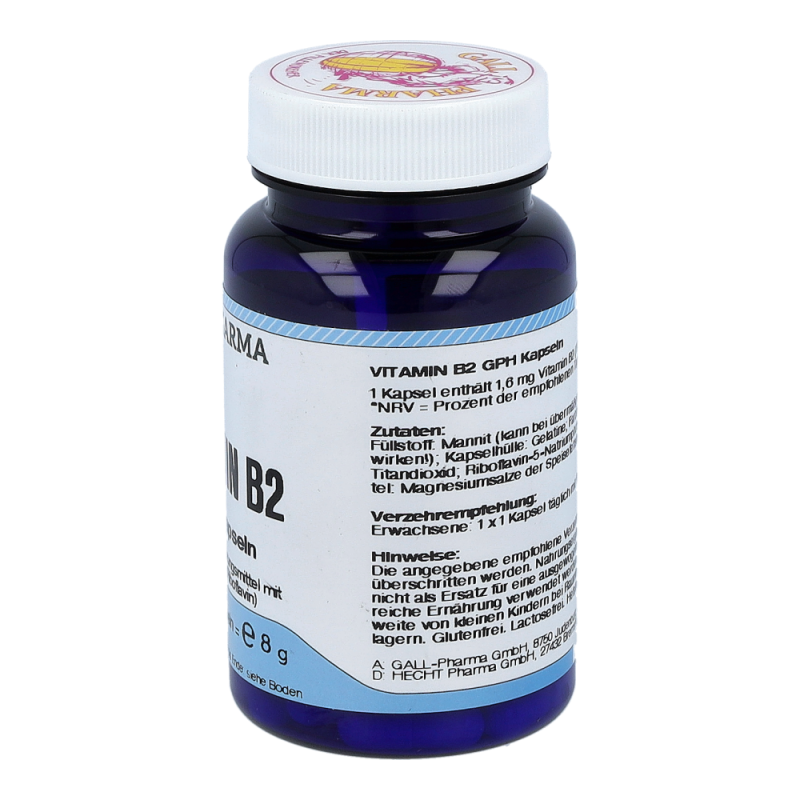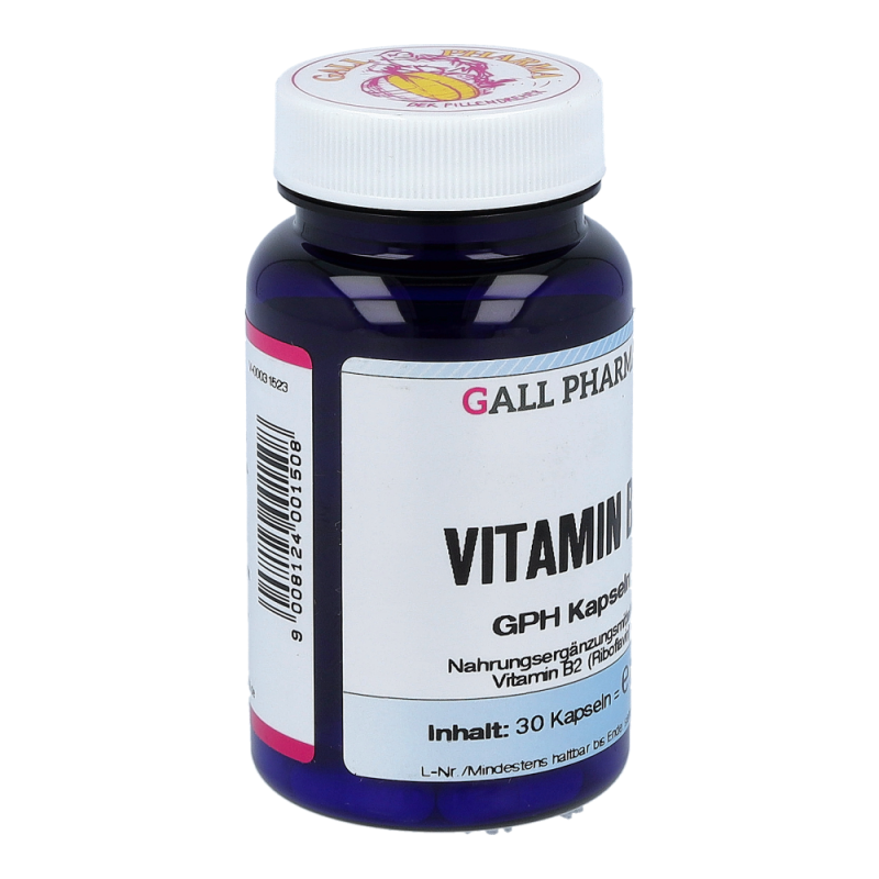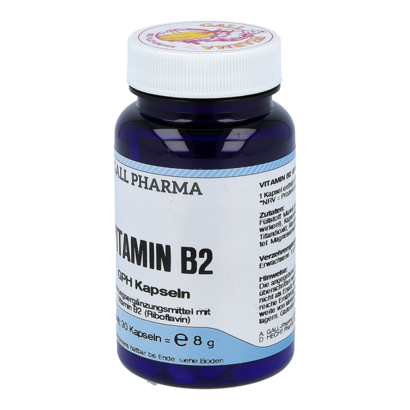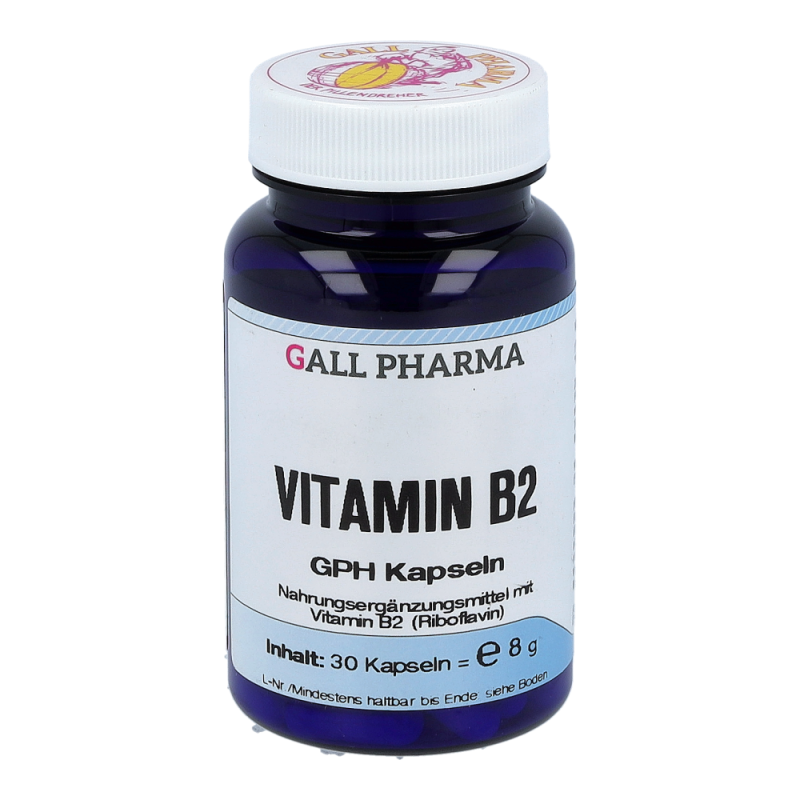 Gall Pharma Vitamin B 2 Kapseln 30 Stk. enthalten 1,6 mg Riboflavin-5-phosphat in einer Hartgelatinekapsel. Vitamin B2 ist mitunter für die Steuerung der Atmung verantwortlich. Gleichzeitig übernimmt es Funktionen im Energiestoffwechsel, insbesondere im Fett-, Kohlenhydrat- und Eiweißstoffwechsel. Ein Mangel kann sich unter anderem auf den Eiweißaufbau auswirken.
