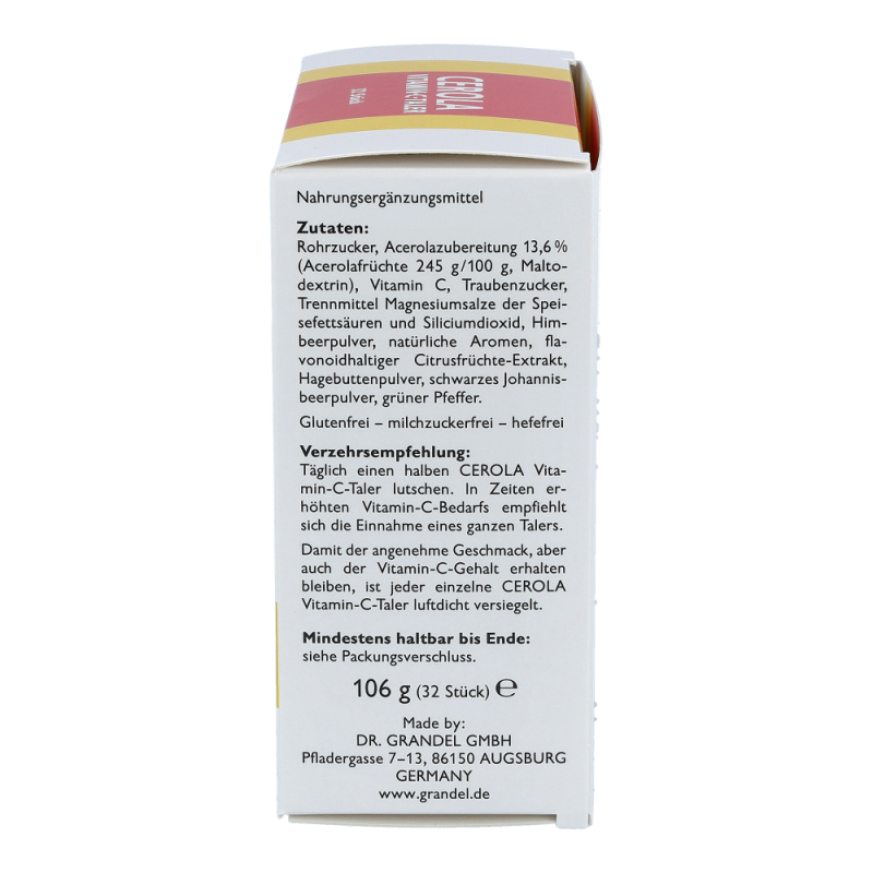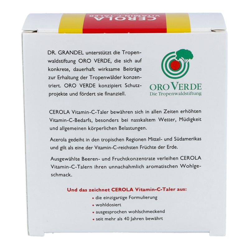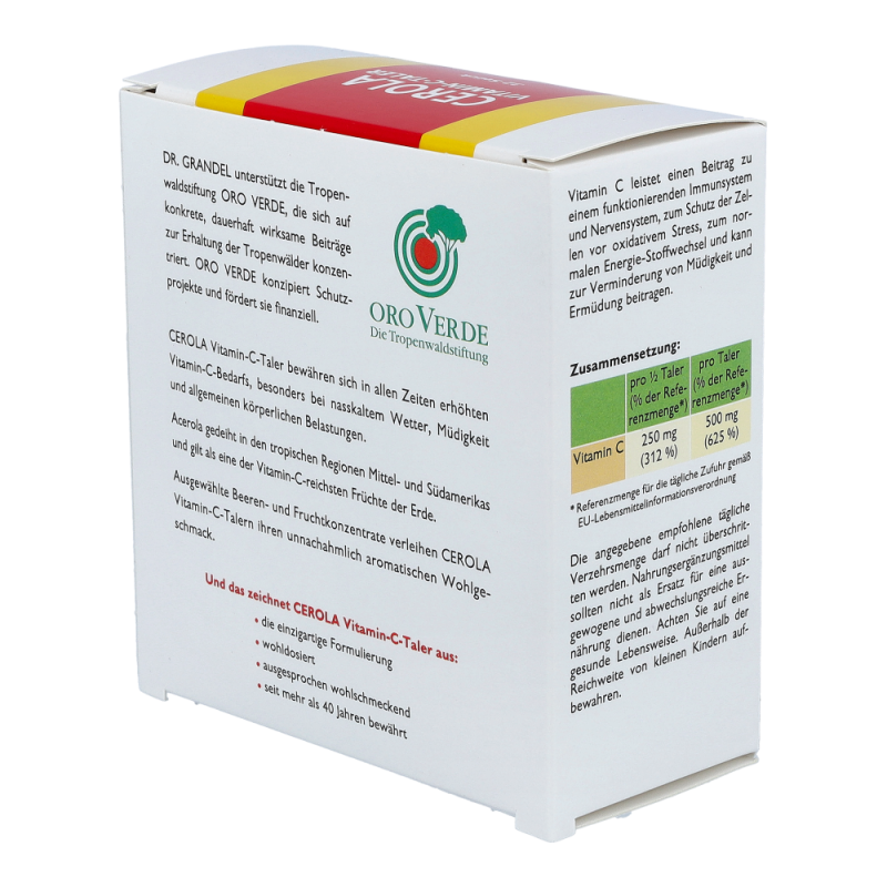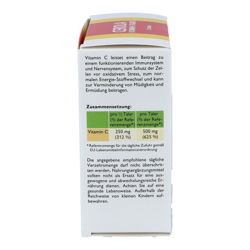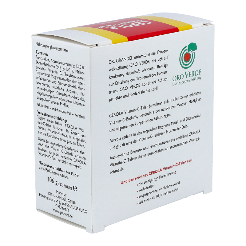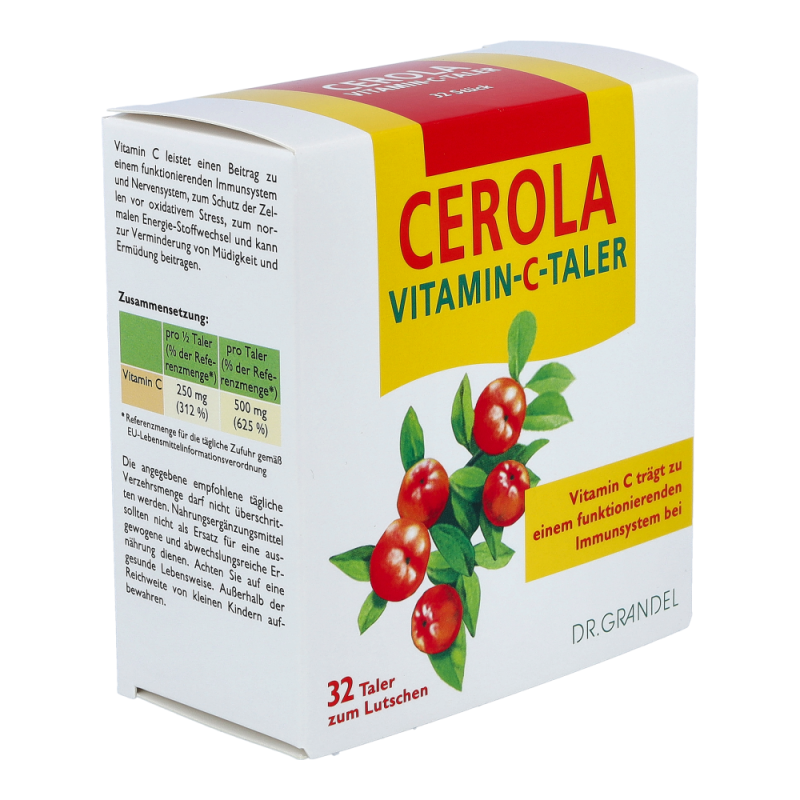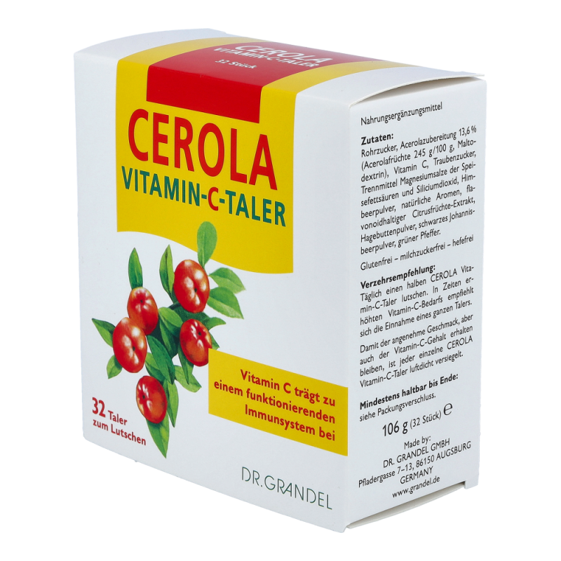 CEROLA Vitamin-C-Taler übernimmt im menschlichen Körper viele lebenswichtige Aufgaben: Es trägt zum Schutz vor oxidativem Stress bei, verbessert die Aufnahme von Eisen, unterstützt den Aufbau von Zähnen, Knochen und Bindegewebe und trägt zur Verminderung von Müdigkeit und Ermüdung bei. Vor allem aber ist Vitamin C für seine positive Wirkung auf das Immunsystem bekannt.