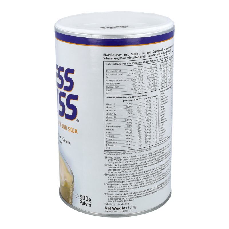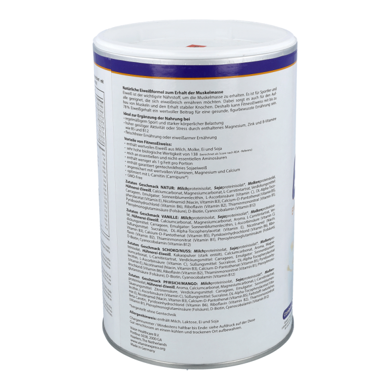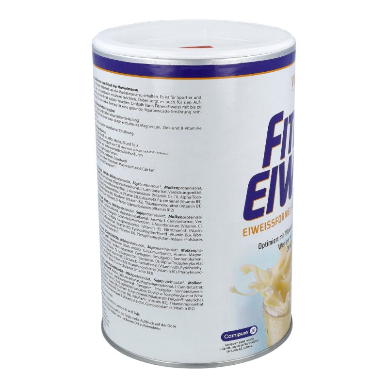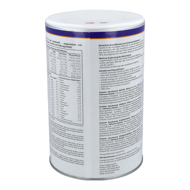 Vitamin Express Fitness Eiweiß ist eine natürliche Eiweißformel für mehr Power, Vitalität und eine gute Figur. Durch eine spezielle Mischung von hochwertigem Eiweiß aus Milch, Wheyprotein (Molkeneiweiß), Ei und Soja, erreicht Fitness Eiweiss eine sehr hohe biologische Wertigkeit.