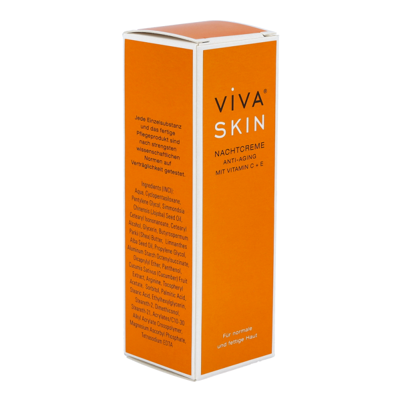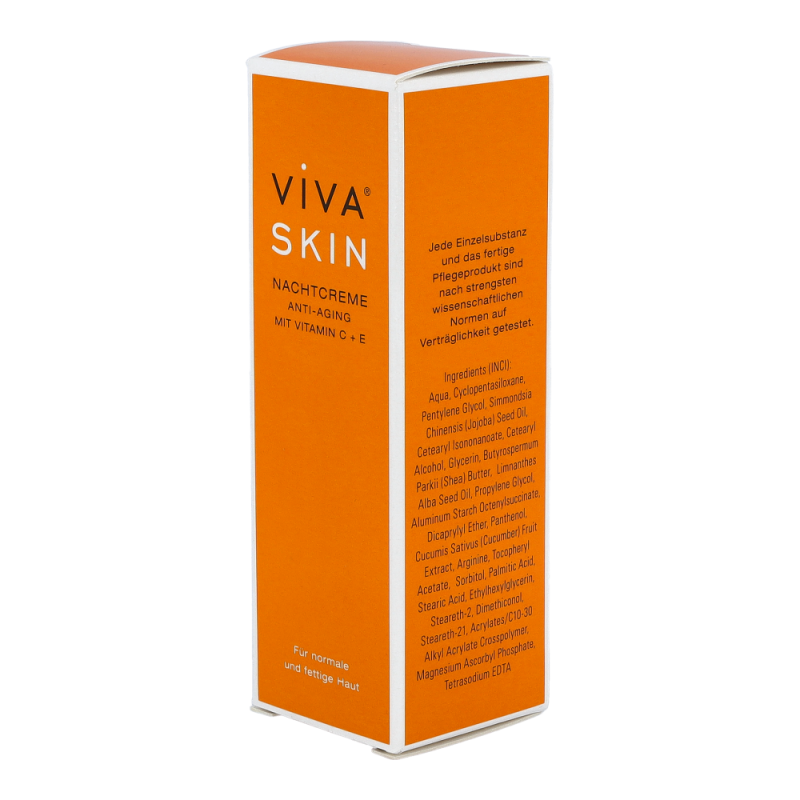 Viva Skin Nachtcreme Anti-Aging hilft dabei, durch die Vitamine C + E irreversible Reaktionen der Haut zu verhindern. Außerdem wird dem Verlangsamen der Hauterneuerungsprozesse entgegengewirkt.
