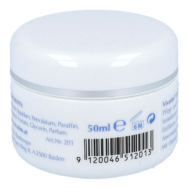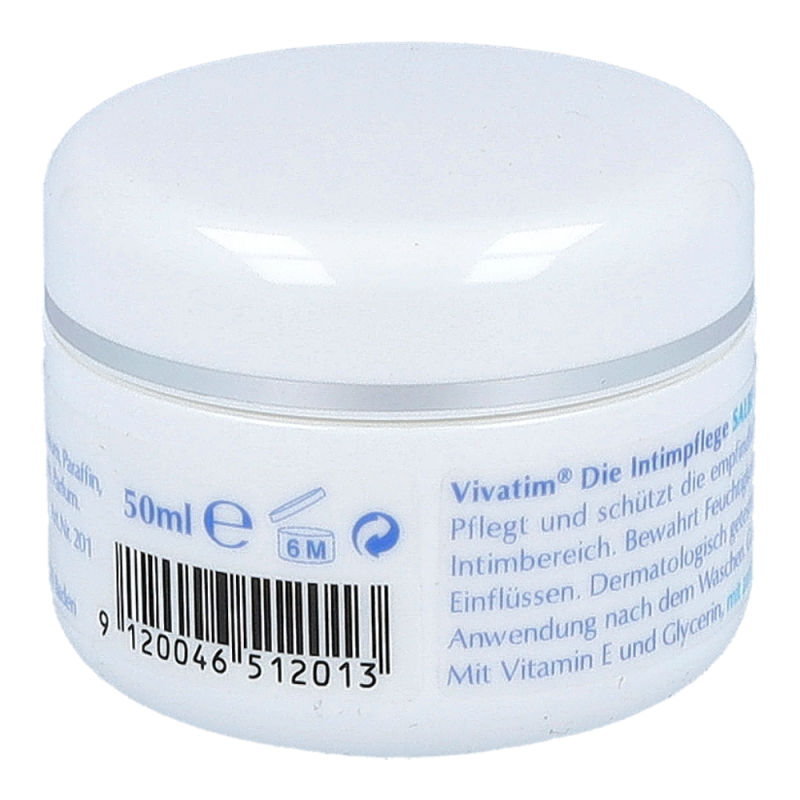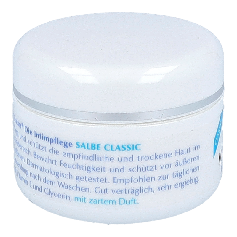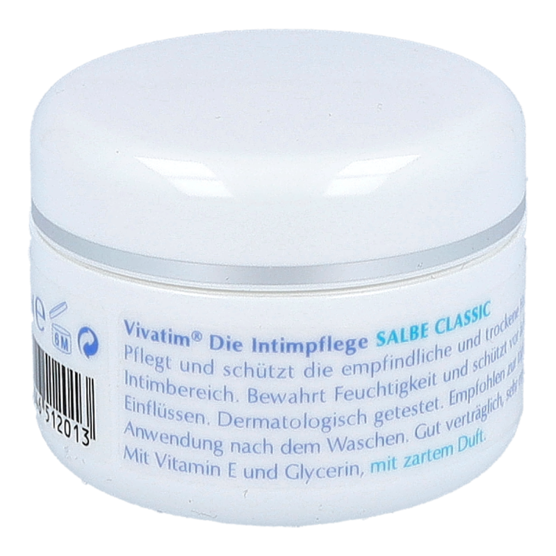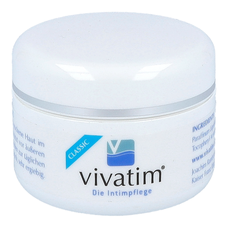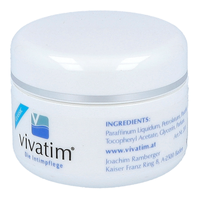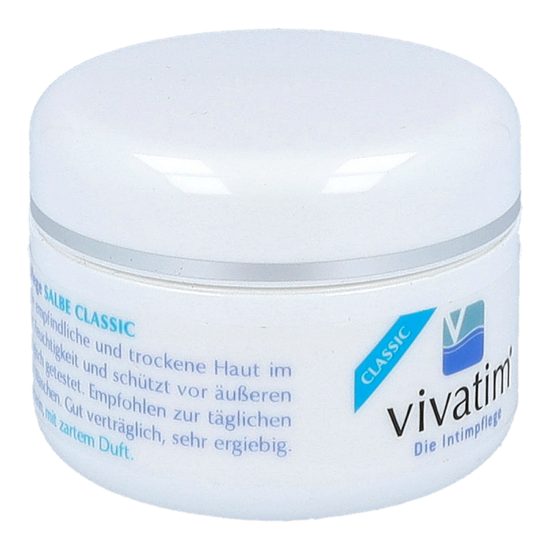 Vivatim Salbe classic hilft der Haut im Intimbereich, sich zu regenerieren. Sie behandelt die Symptome von trockener Scheide, wie Juckreiz oder Rötungen, und auch Ausfluss und unangenehmen Geruch.Vivatim Salbe classic ist eine Salbe mit zartem Duft zur Pflege des Intimbereichs. Sie kann unter anderem nach dem Schwimmen oder vor/nach dem Geschlechtsverkehr angewendet werden. Dank der wertvollen Inhaltsstoffe Glycerin und Vitamin E wird die Haut geglättet, wodurch keine Risse mehr entstehen können, durch die Bakterien und Keime eindringen können, und so wird einer Infektion vorgebeugt. Außerdem bildet sie einen Schutzfilm, dadurch werden äußere Einwirkungen abgedämpft. Zusätzlich reguliert und erhält die Vivatim Salbe classic die Feuchtigkeit im Intimbereich. So wird die Immunabwehr erhalten und gleichzeitig schützt sie vor Juckreiz. Obwohl die positive Wirkung schnell eintritt, wird ein optimales Ergebnis nur bei langfristiger Anwendung erreicht. Die Vivatim Salbe classic ist frei von Farbstoffen und Hormonen..