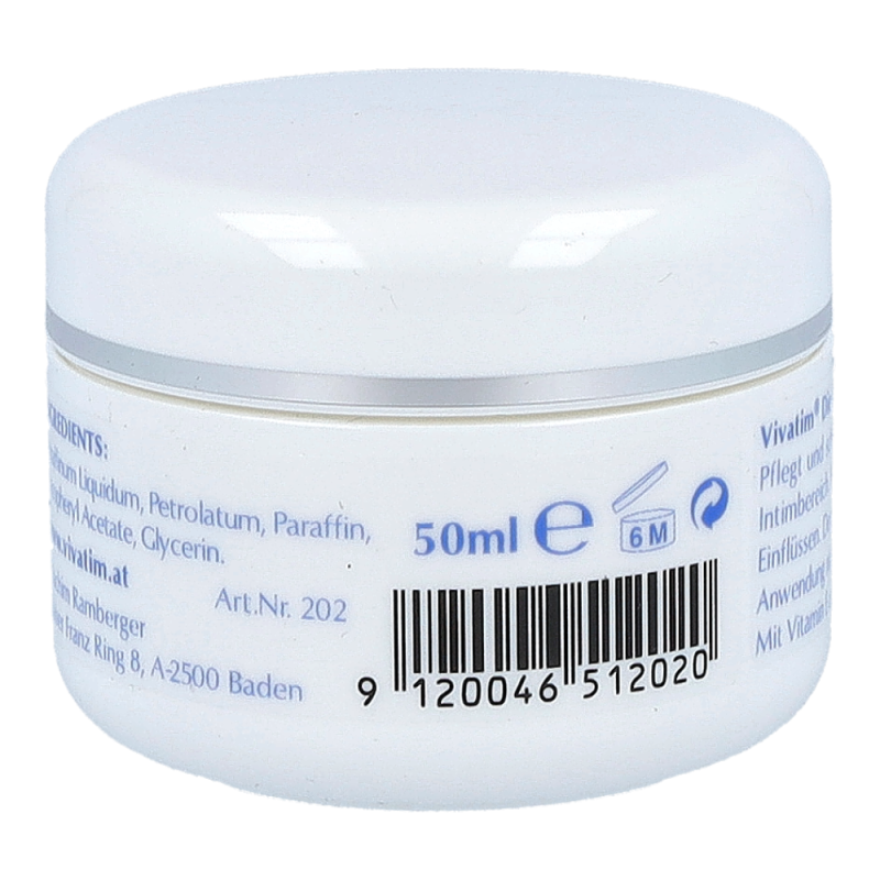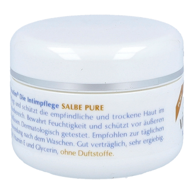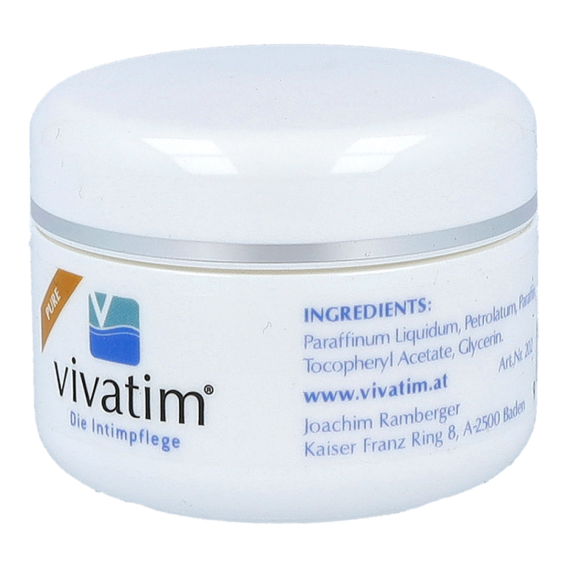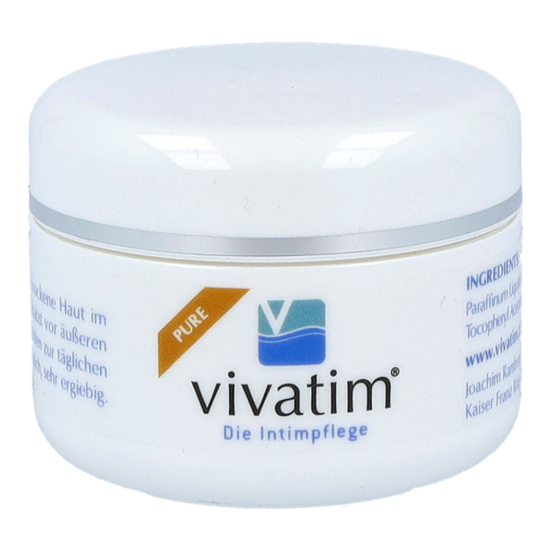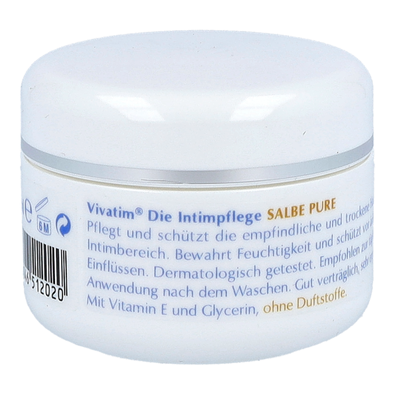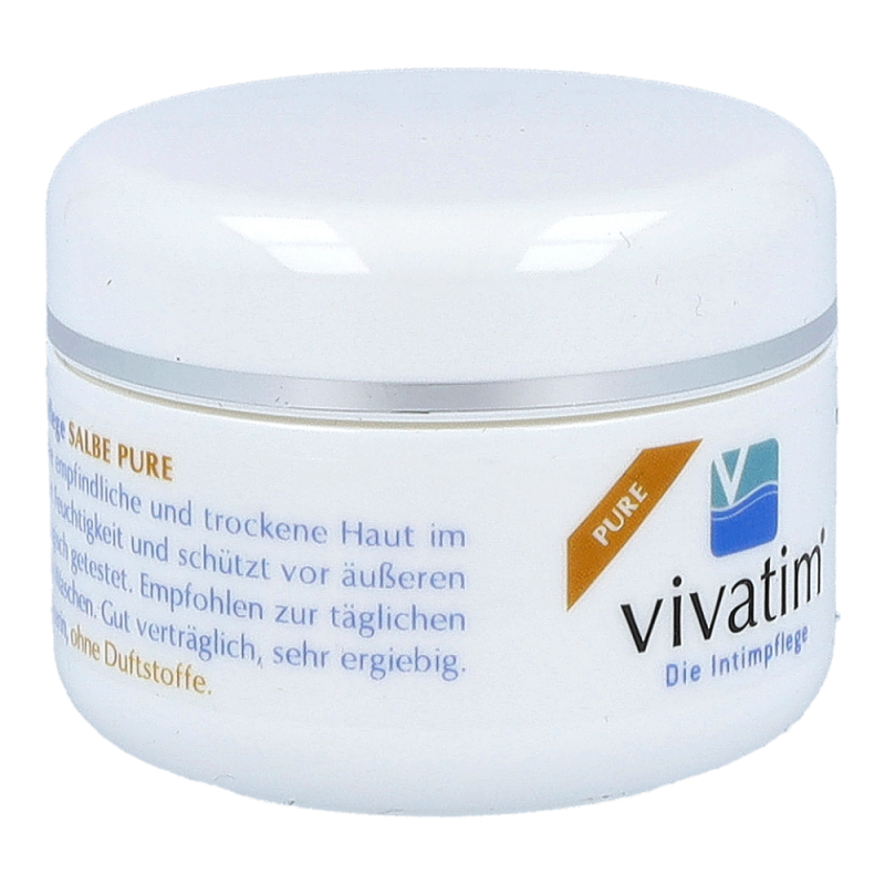 Vivatim Salbe Pure bewahrt die Feuchtigkeit des Intimbereiches und unterstützt empfindliche Haut bei ihrer Erholung. Die Salbe überzeugt mit ihrer äußerst guten und gynäkologisch bestätigten Verträglichkeit und ist vor allem zur Langzeitanwendung geeignet.!