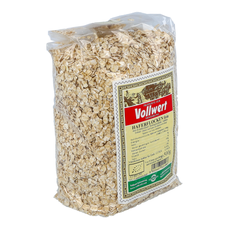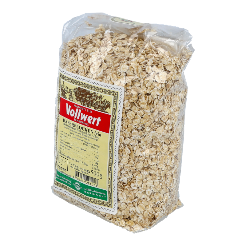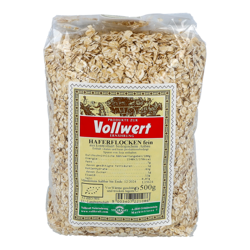 Vollkraft Haferflocken FEIN kbA eignen sich optimal fürs Müsli oder für die Zubereitung von Haferbrei. Sehr leichte Verdaulichkeit.