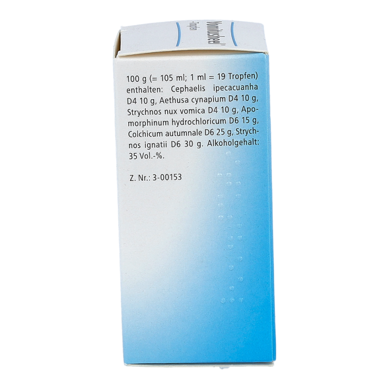 – Die Wirkstoffe sind: Cephaelis ipecacuanha D4 10 g, Aethusa cynapium D4 10 g, Strychnos nux vomica D4 10 g, Apomorphinum hydrochloricum D6 15 g, Colchicum autumnale D6 25 g, Strychnos ignatii D6 30 g.
