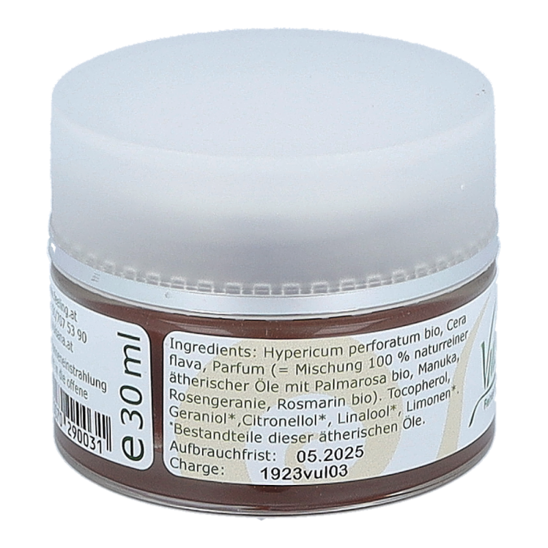 Hypericum perforatum bio, Cera flava, Parfum (= Mischung 100 % naturreiner ätherischer Öle mit Palmarosa bio, Manuka, Rosengeranie, Rosmarin bio). Tocopherol, Geraniol*, Citronellol*, Linalool*, Limonen*.