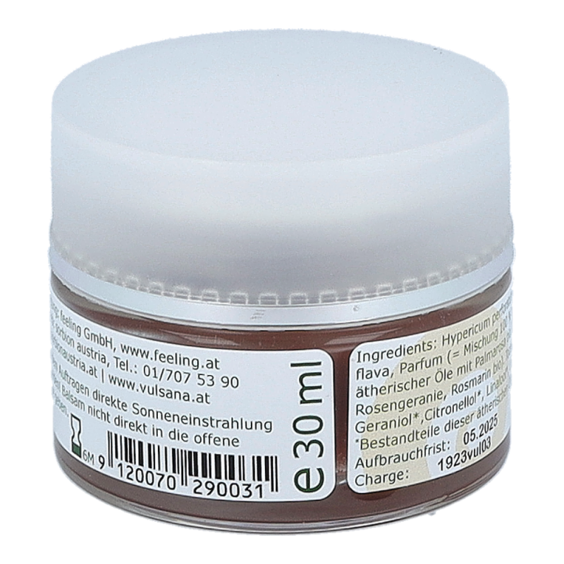 Zur Optimierung der Narbenpflege kann es sowohl bei frischen als auch bei älteren Narben angewendet werden, um diesen ihre Geschmeidigkeit wieder zu geben und gegebenenfalls Verhärtungen zu reduzieren. Ebenfalls kann es prohylaktisch angewendet bei Dehnungsstreifen helfen. Selbstverständlich kann es auch bei Hautirritationen wie beispielsweise trockener, rissiger, juckender oder auch bei schuppender Haut aufgetragen werden. Auch bei leichten Verbrennungen wirkt sich Vulsana Wundrand- und Narbenpflege positiv auf die Abheilung und Stabilisierung der betroffenen Areale aus. Der Balsam enthält zusätzlich noch natürliches Bienenwachs.