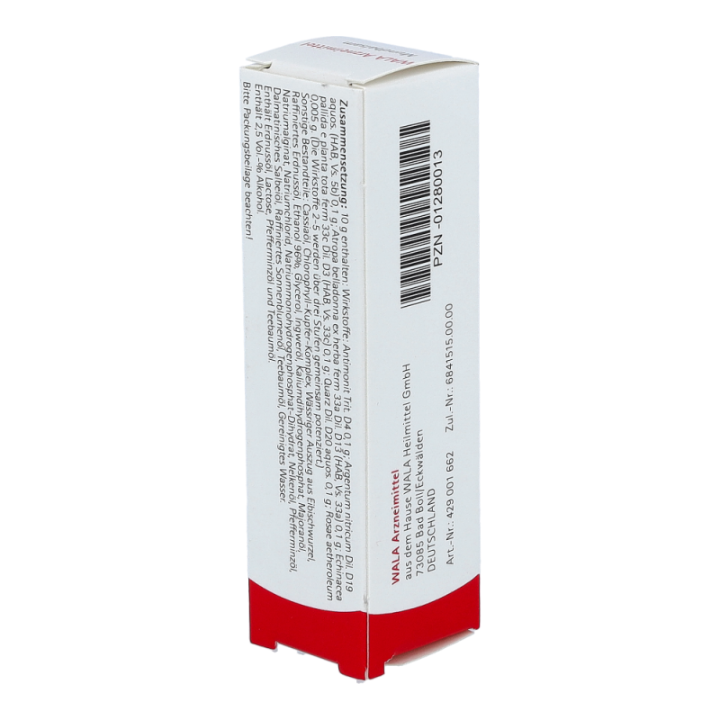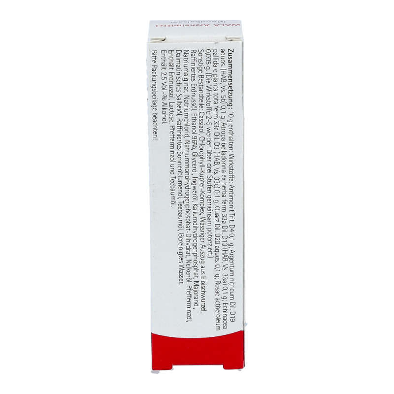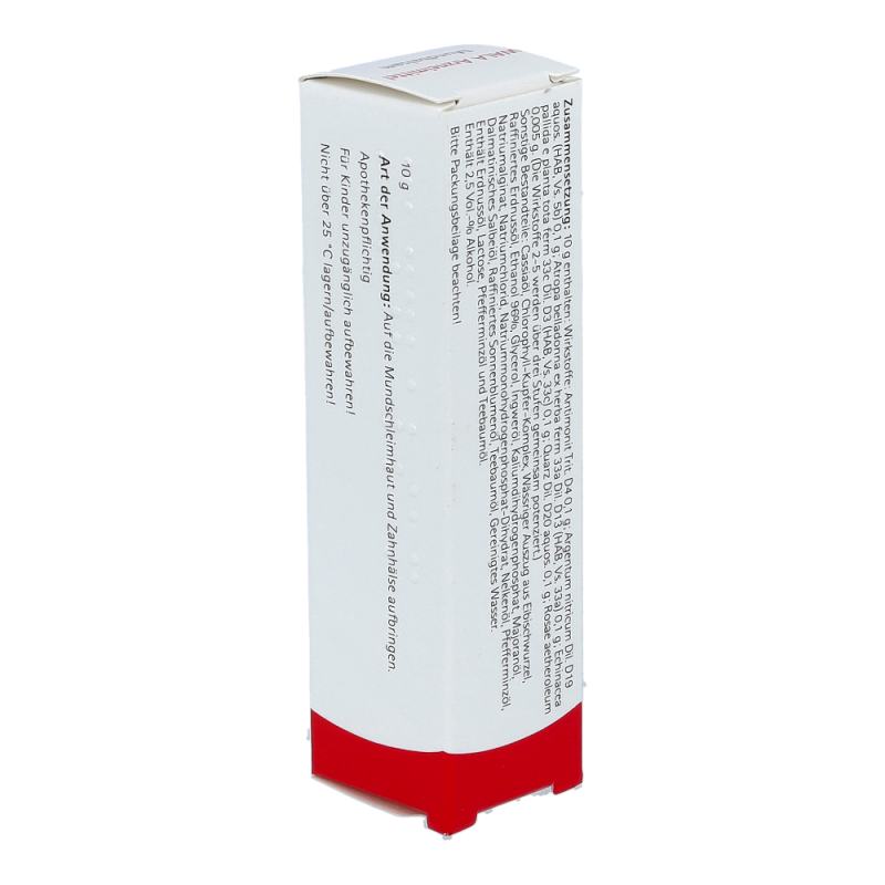 10 g enthalten: 10 mg Quarz aquosum D20, 10 mg Atropa belladonna ex herba ferm 33a D13, 10 mg Argentum nitricum aquosum D19, 10 mg Echinacea pallida e planta tota ferm 33c D3, 10 mg Antimonit D4, 0.50 mg Rosenöl, Chinesischer Zimt-Öl, Chlorophyll, Kupfer-Komplex, Eibischwurzel-Extrakt Auszugsmittel: Wasser, Erdnussöl raffiniert, Ethanol 96% (V/V), Glycerol, Ingweröl ätherisch, Kaliumdihydrogenphosphat, Majoranöl, Natrium alginat, Natriumchlorid, Dinatriumhydrogenphosphat-2-Wasser, Nelkenöl, Pfefferminzöl, Salbeiöle dalmatinisch, Sonnenblumenöl raffiniert, Wasser gereinigt, Teebaumöl, Lactose