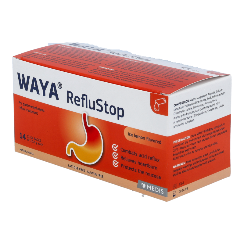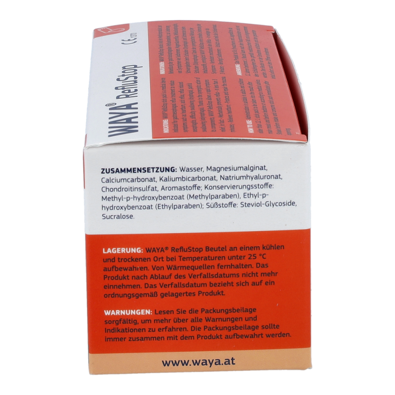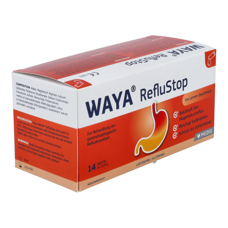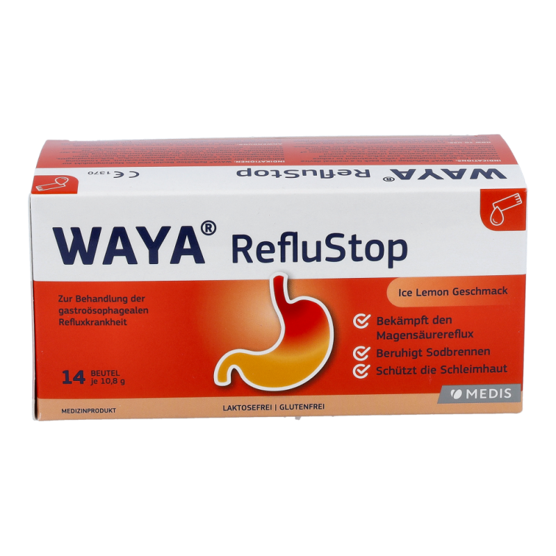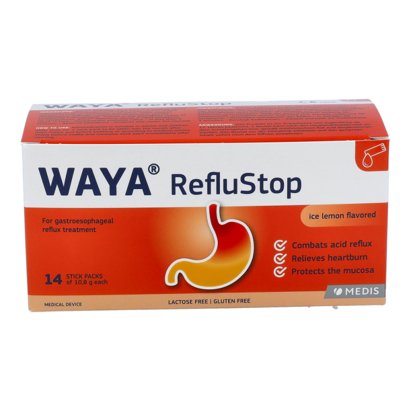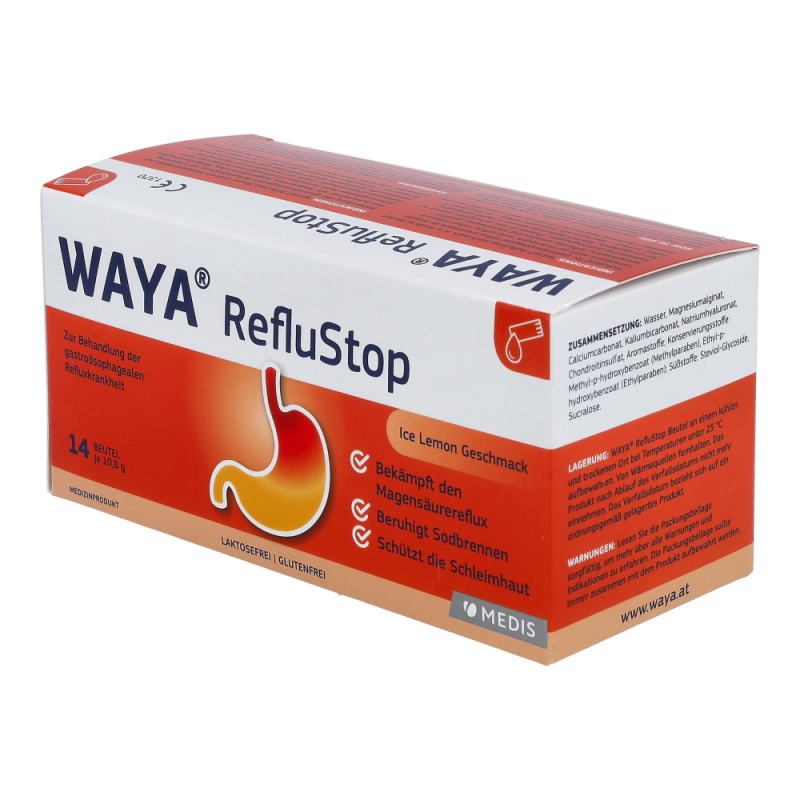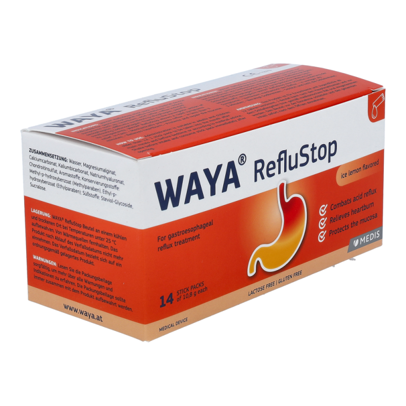 WAYA StopReflux lindert die Symptome von gastroösophagealem Reflux wie: Sodbrennen (auch während der Schwangerschaft), Magensäurereflux, Refluxösophagitis, Schwierigkeiten beim Schlucken und Schmerzen beim Schlucken.