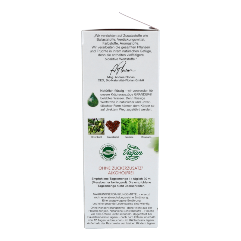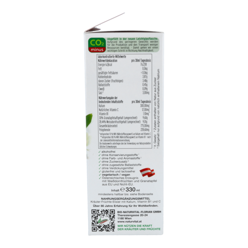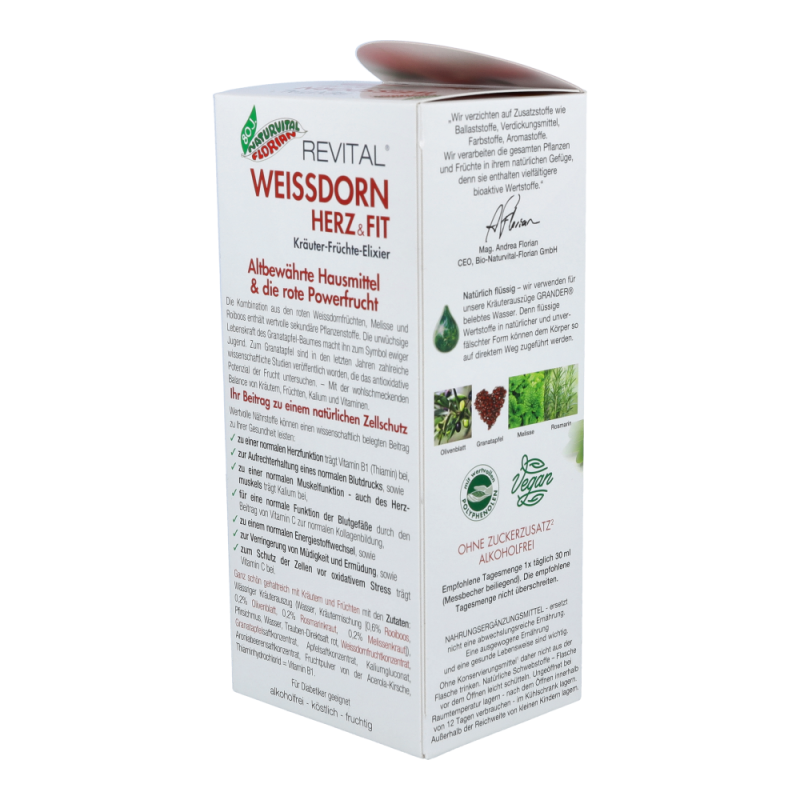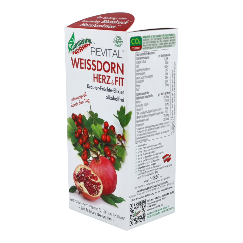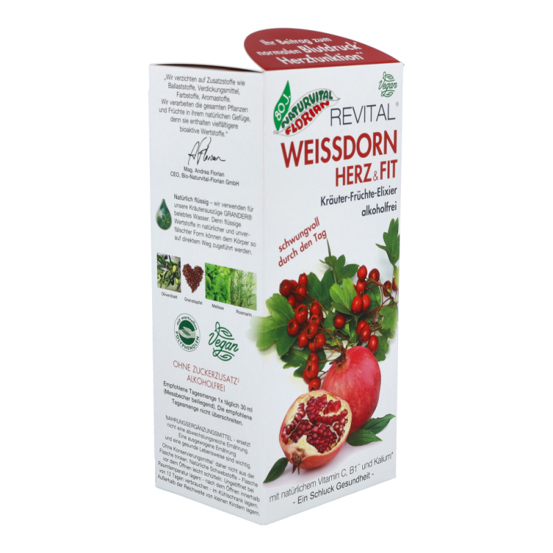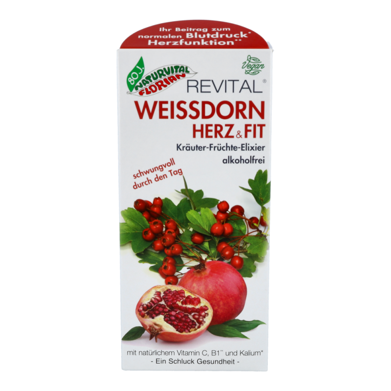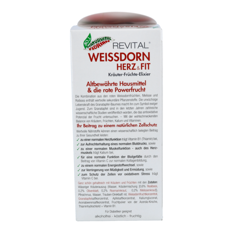 Weißdorn Granatapfel Elixier Bio zur Aufrechterhaltung eines normalen Blutdrucks, zu einer normalen Muskelfunktion, zu einem normalen Energiestoffwechsel sowie zur Verringerung von Müdigkeit und Ermüdung.