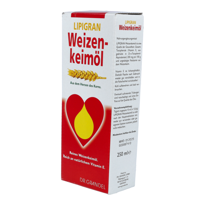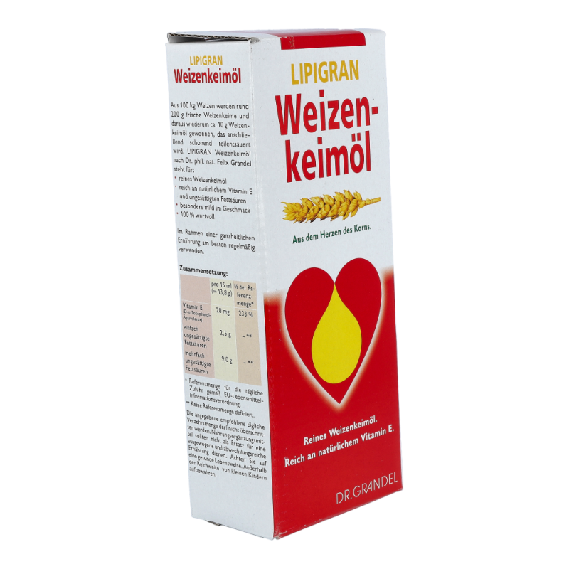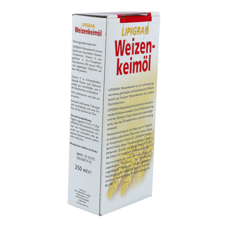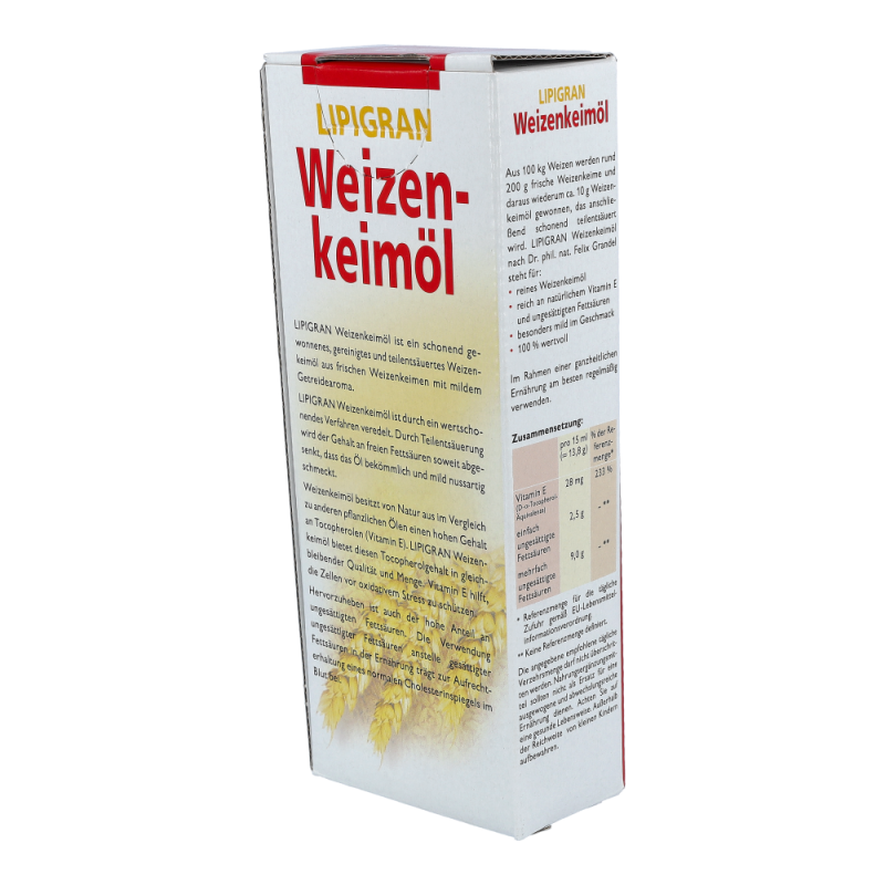 Weizenkeim Öl Grandel ist ein schonend gewonnenes, gereinigtes und teilentsäuertes Weizenkeimöl aus frischen Weizenkeimen mit mildem Getreidearoma.Es ist durch ein wertschonendes Verfahren veredelt. Durch Teilentsäuerung wird der Gehalt an freien Fettsäuren soweit abgesenkt, dass das Öl mild nussartig schmeckt. Erhältlich in den Varianten 100ml und 250ml.