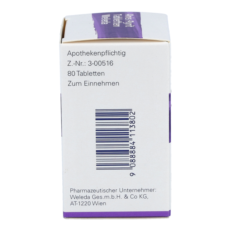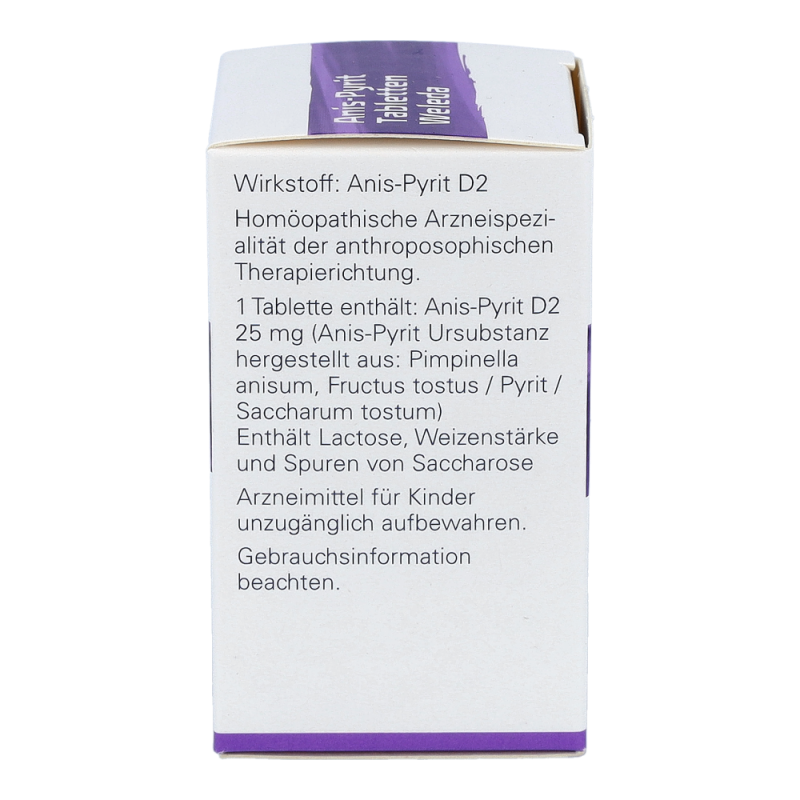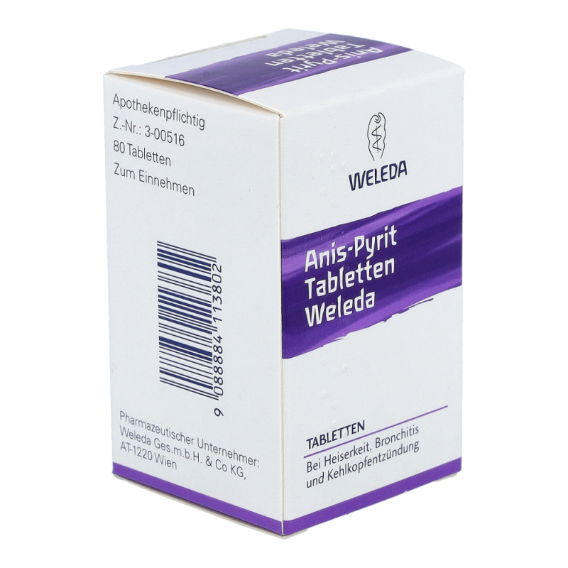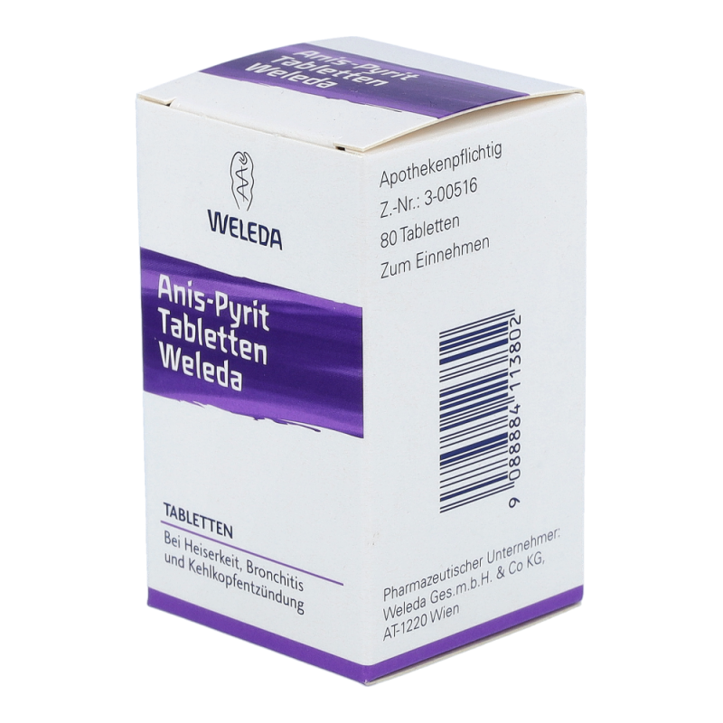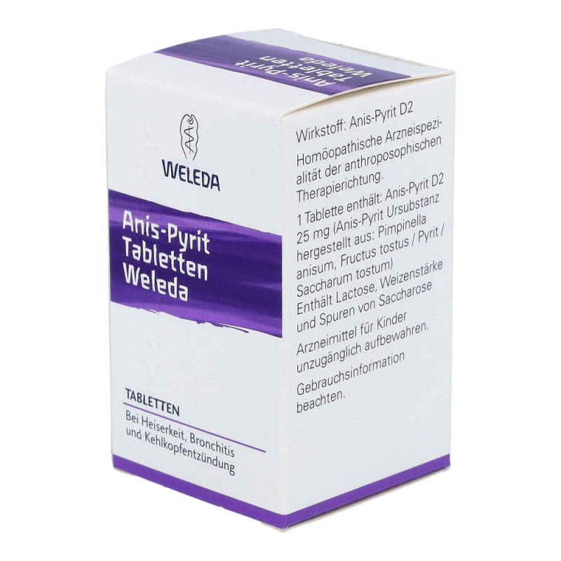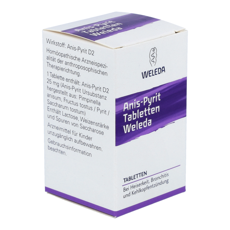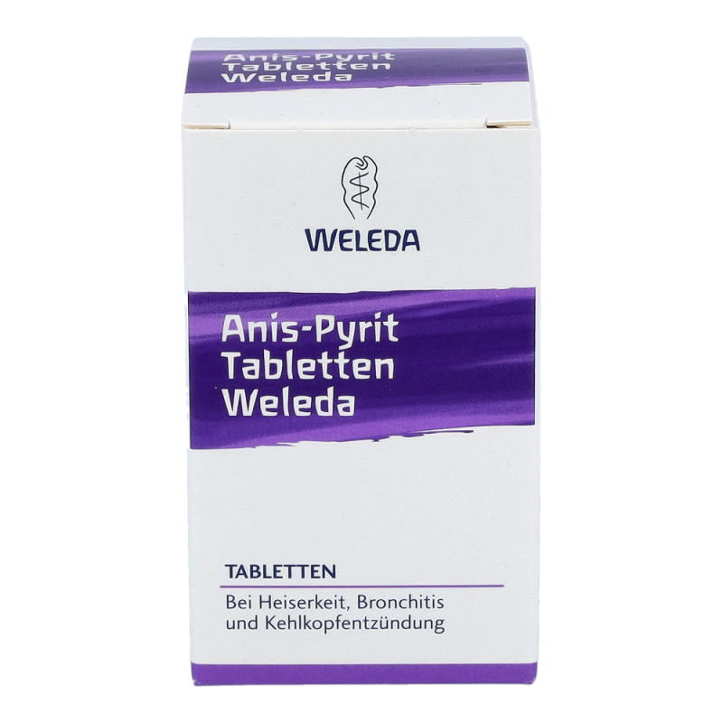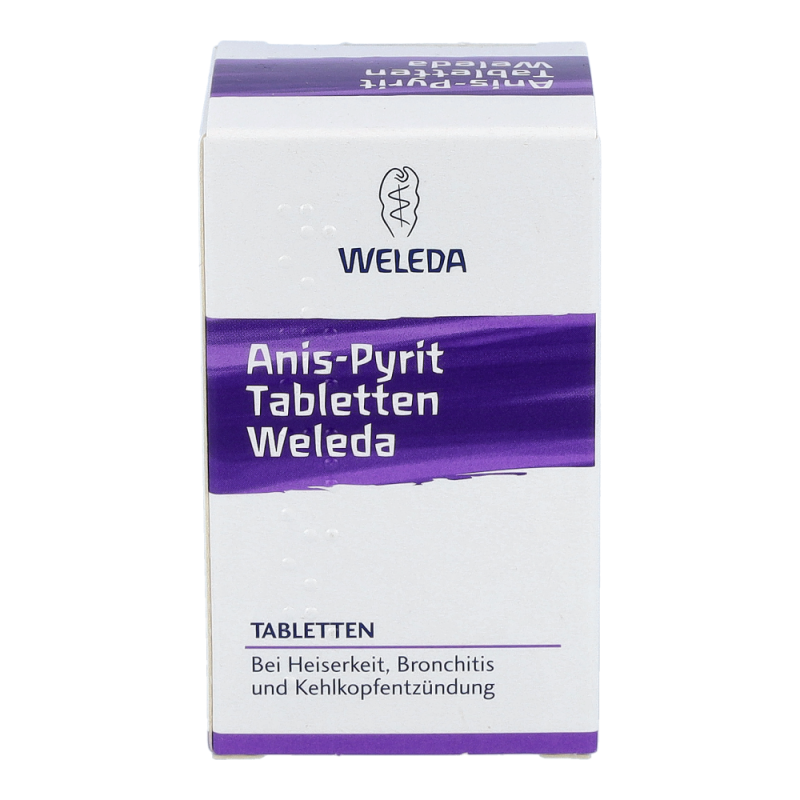 Weleda Anis Pyrit Tabletten lindern Halsschmerzen und Heiserkeit. Das ätherische Öl der aromatischen Anisfrucht wirkt antibakteriell und krampflösend. Auch nach Bronchial- und Kehlkopfkatarrh anwendbar.