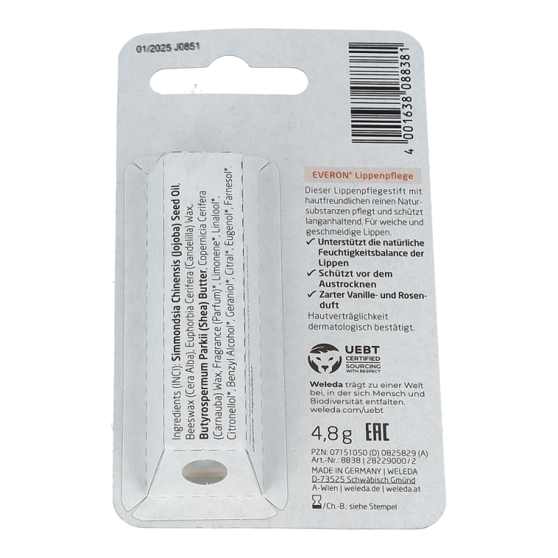 Weleda Everon Lippenpflegestift besänftigt und pflegt, ohne einen Film auf der Haut zu hinterlassen, da sie frei von Rohstoffen auf Mineralölbasis ist.
