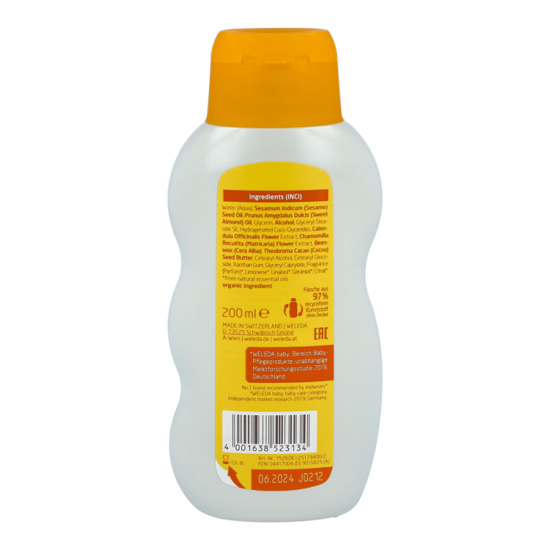 Weleda Pflegemilch Calendula schützt empfindliche Baby- und Kinderhaut ganz natürlich und spendet ihr Feuchtigkeit. Wertvolles Mandelöl aus kontrolliert-biologischem Anbau hält die Haut weich und geschmeidig und schützt vor dem Austrocknen.