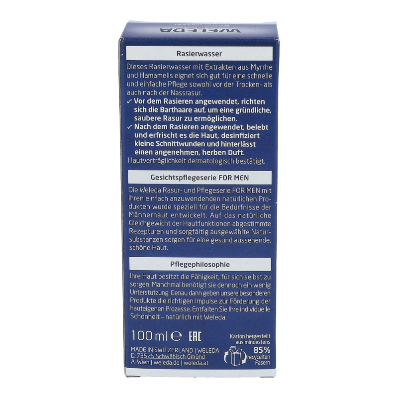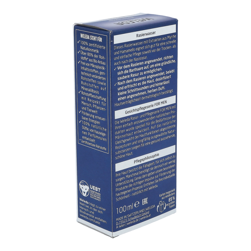 Weleda Rasierwasser ist als Pre- und After-Shave für die Trocken- und Nassrasur geeignet. Vor dem Rasieren angewendet, richten sich die Barthaare auf, was eine saubere Rasur erleichtert. Nach dem Rasieren erfrischt und belebt Weleda Rasierwasser die Haut. Es duftet angenehm herb und desinfiziert kleine Schnittwunden.