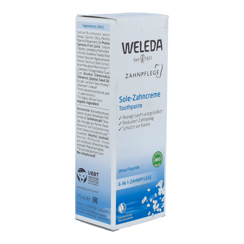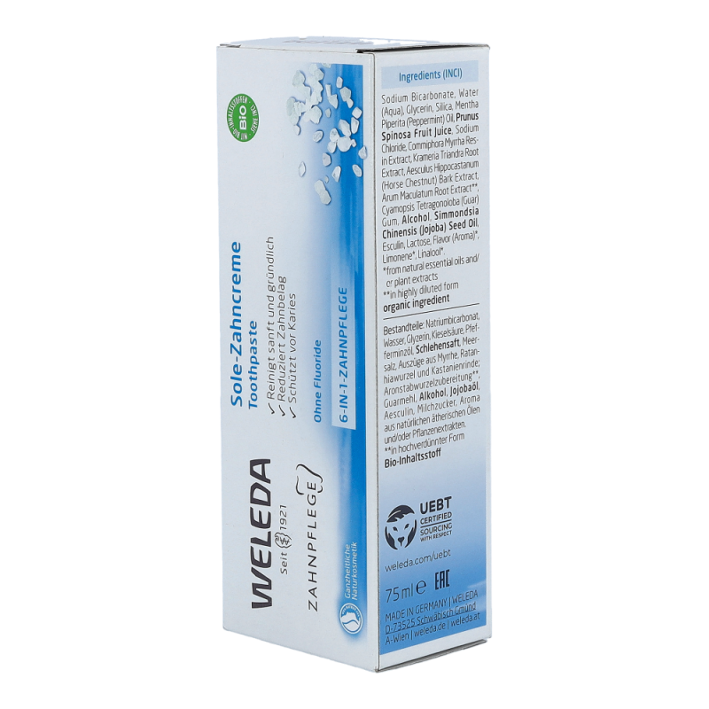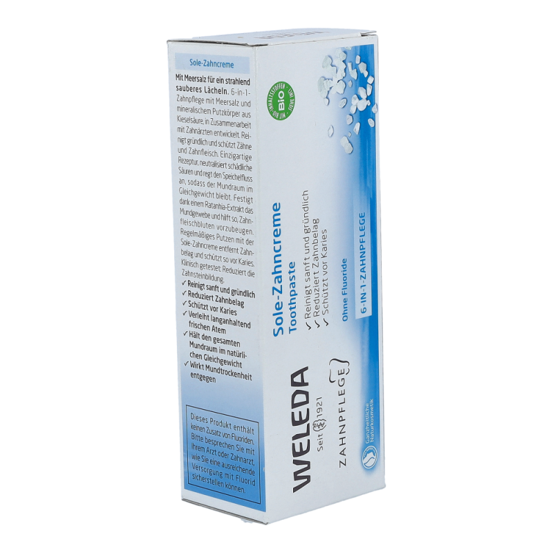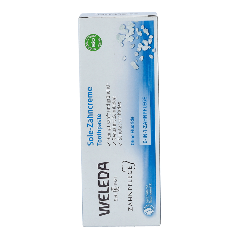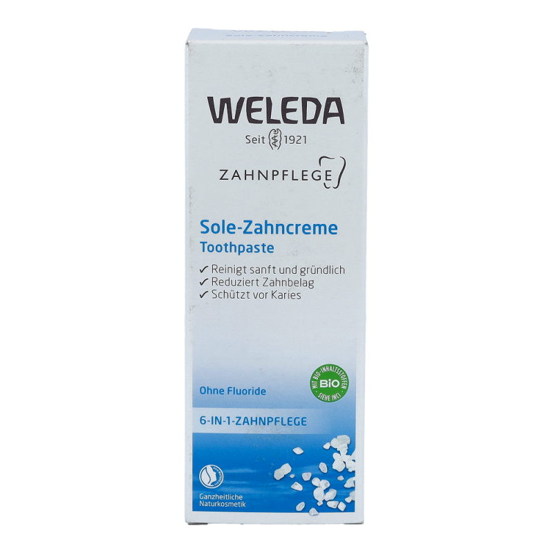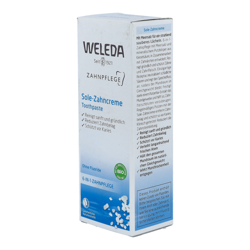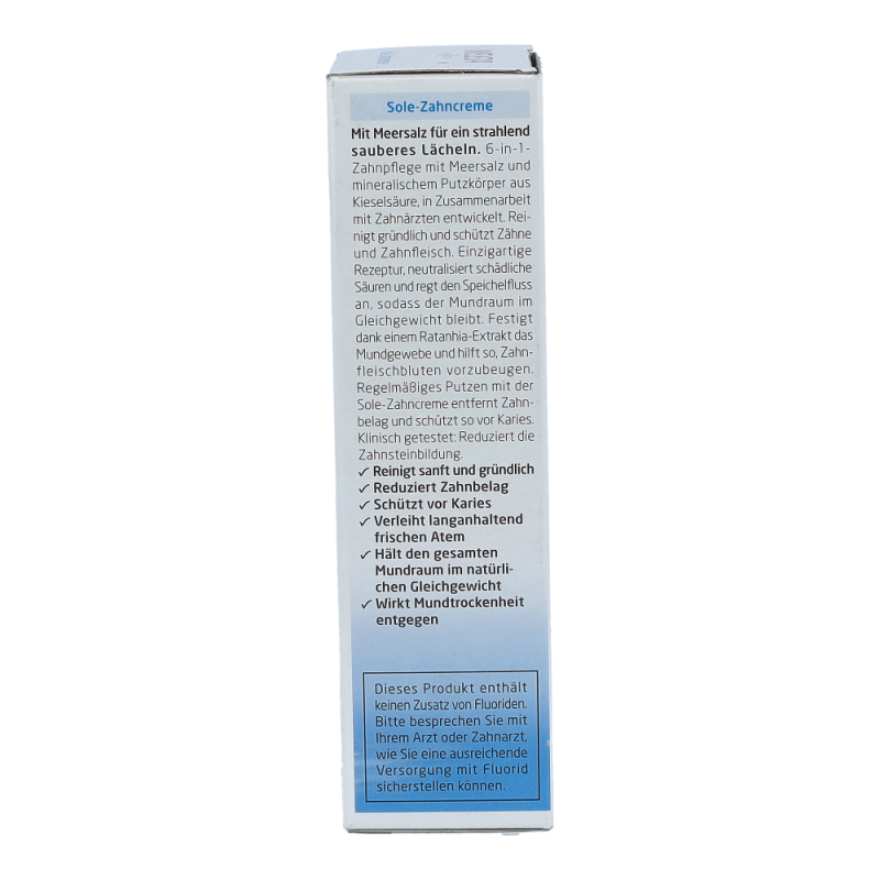 Die Sole-Zahncreme mit einem löslichen Putzkörper aus Natriumcarbonat (Salz) beugt Karies  vor und hemmt somit auch die Neubildung von Zahnstein. Der einzigartige Putzkörper aus Salzkristallen regt den Speichelfluss und damit die physiologische Selbstreinigung an. Der angenehm prickelnde, leicht salzige Geschmack der Sole-Zahncreme wird abgerundet durch anregendes Pfefferminzöl.