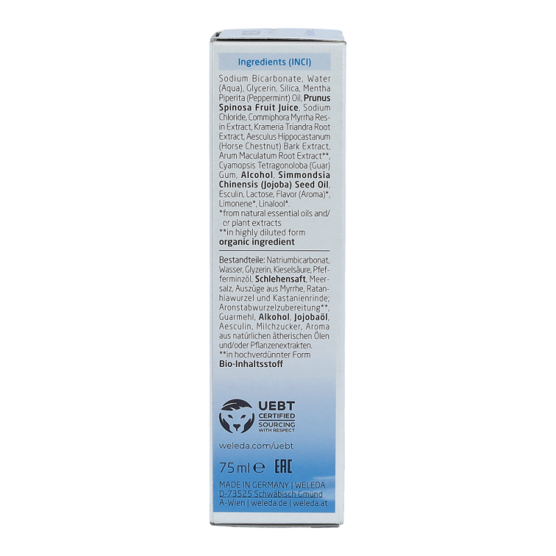 Water (Aqua), Sodium Bicarbonate, Glycerin, Silica, Prunus Spinosa Fruit Juice, Mentha Piperita (Peppermint) Oil, Cyanopsis Tetragonoloba (Guar) Gum, Commiphora Myrrha Extract, Krameria Triandra Root Extract, Aesculus Hippocastanum (Horse Chestnut) Bark Extract, Esculin, Arum Maculatum Root Extract**, Sodium Chloride, Sodium Sulfate, Sodium Silicate, Flavour (Aroma)*, Limonene*, Linalool*, Alcohol, Simmondsia Chinensis (Jojoba) Seed Oil.[parasep] * from natural essential oils[parasep] ** in highly diluted form