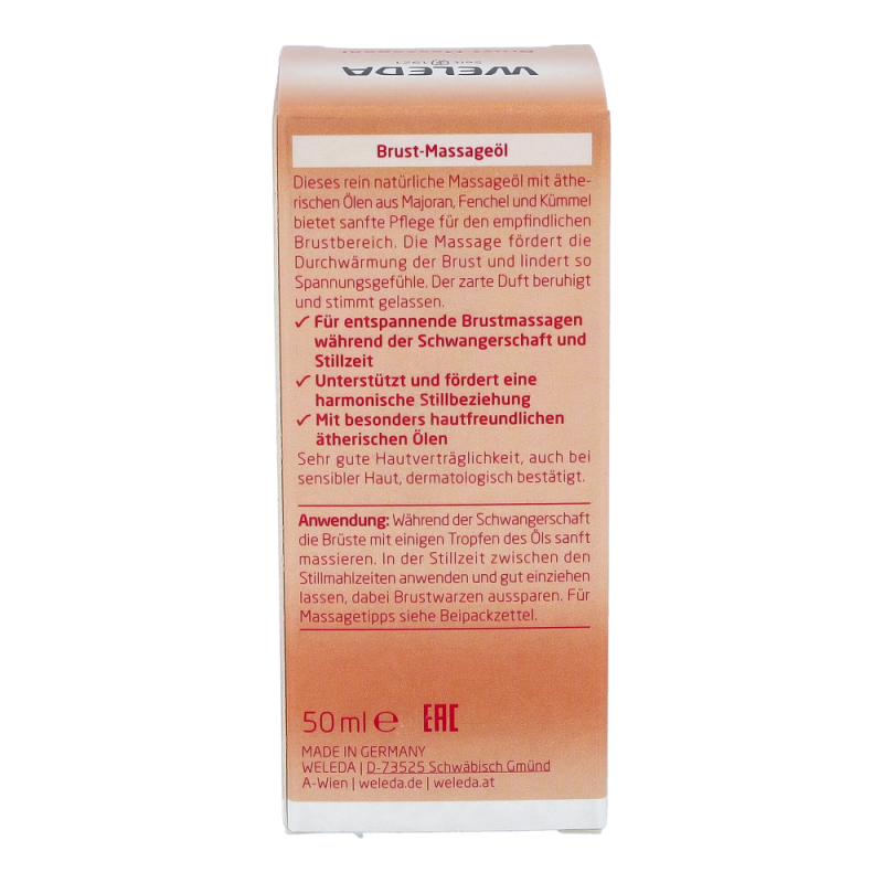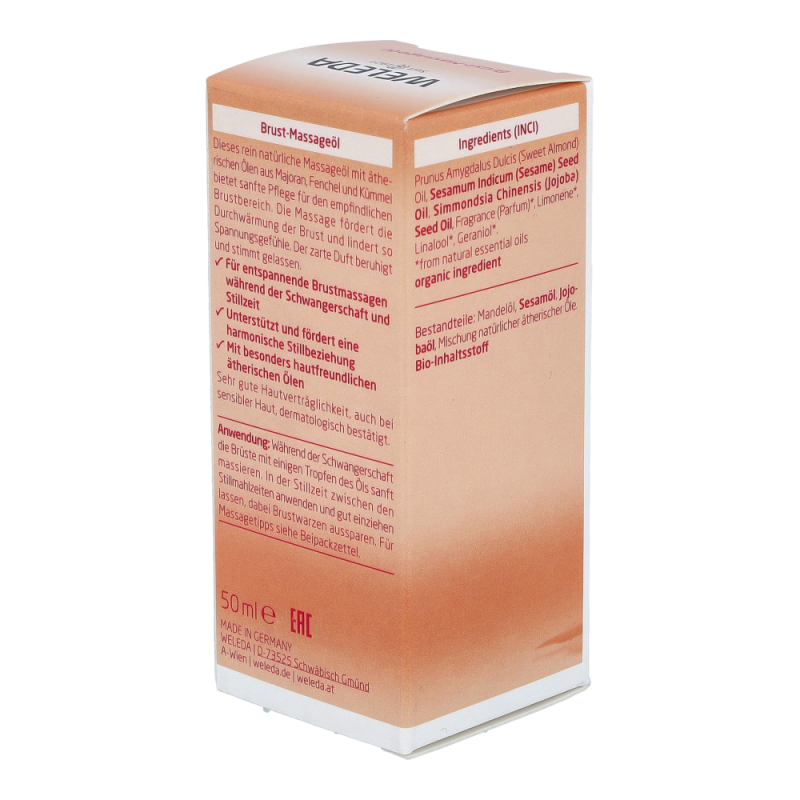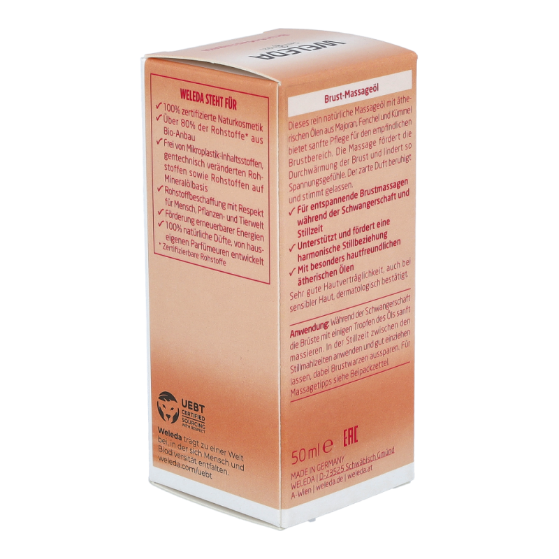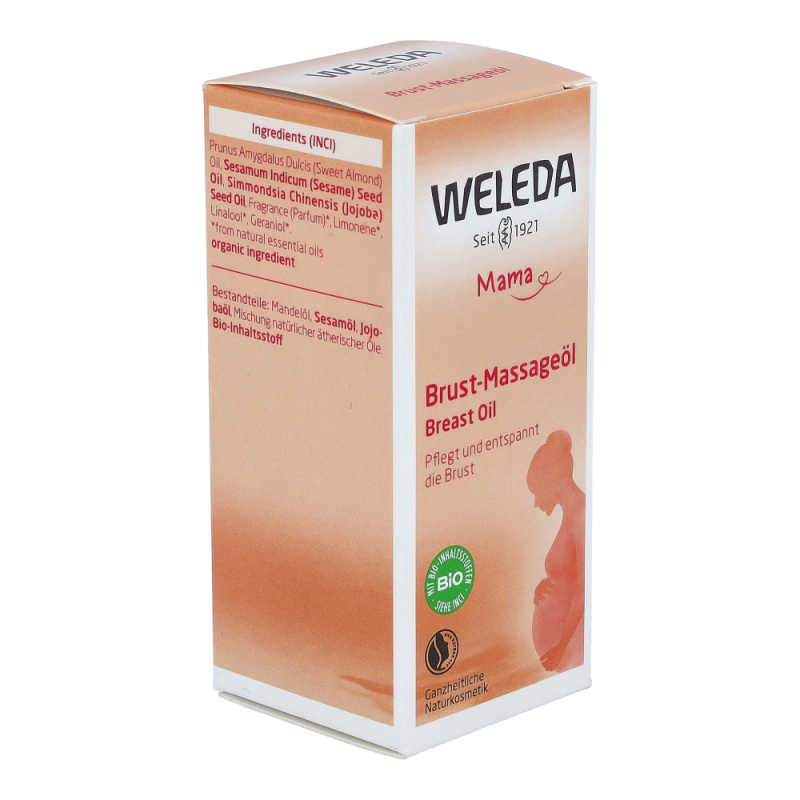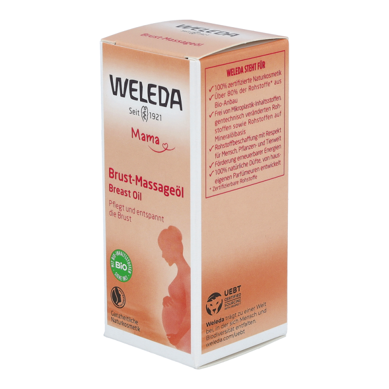 Weleda Stillöl ist eine milde Komposition auf Grundlage von geschmeidig glättendem Mandelöl. Sanft einmassiert, fördert es so die Durchblutung des Gewebes und die Durchwärmung der Brust.
