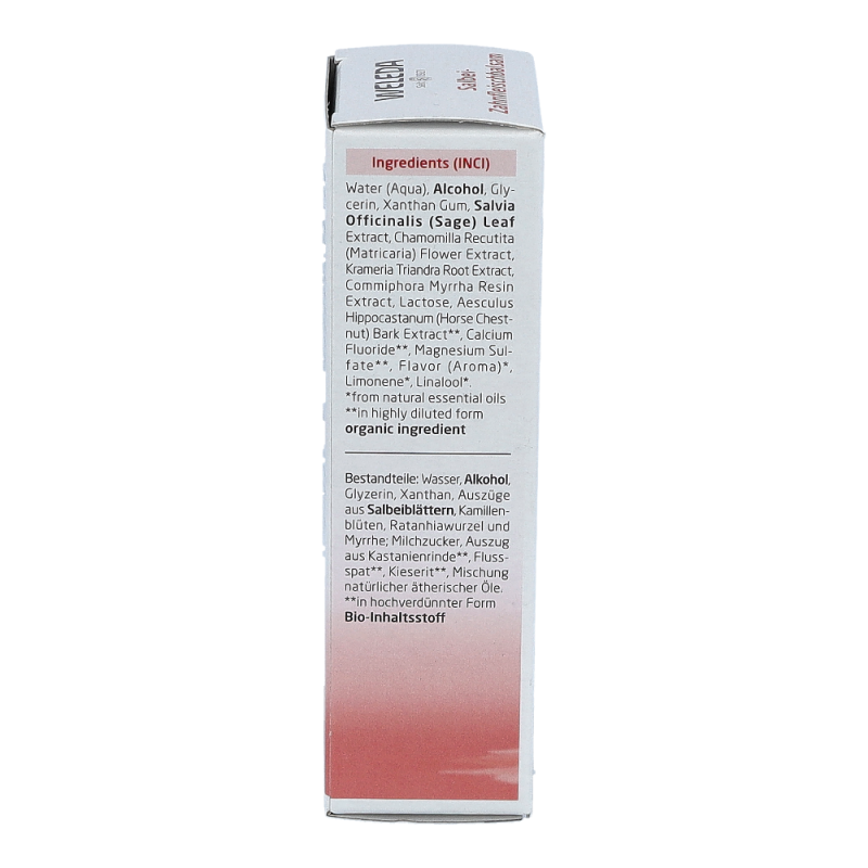 Water (Aqua,) Alcohol, Glycerin, Xanthan Gum, Salvia Officinalis (Sage) Leaf Extract, Chamomilla Recutita (Matricaria) Flower Extract, Krameria Triandra Root Extract, Commiphora Myrrha Resin Extract, Lactose Aesculus Hippocastanum (Horse Chestnut) Bark Extract (in highly diluted form), Calcium Fluoride (in highly diluted form), Magnesium Sulfate, Flavor (Aroma), Limonene, Linalool