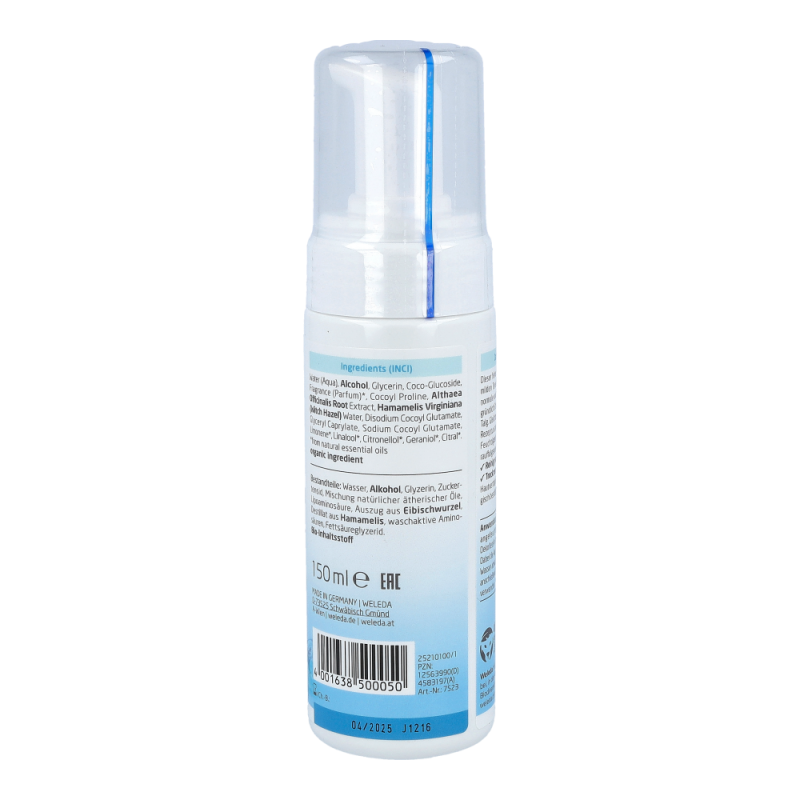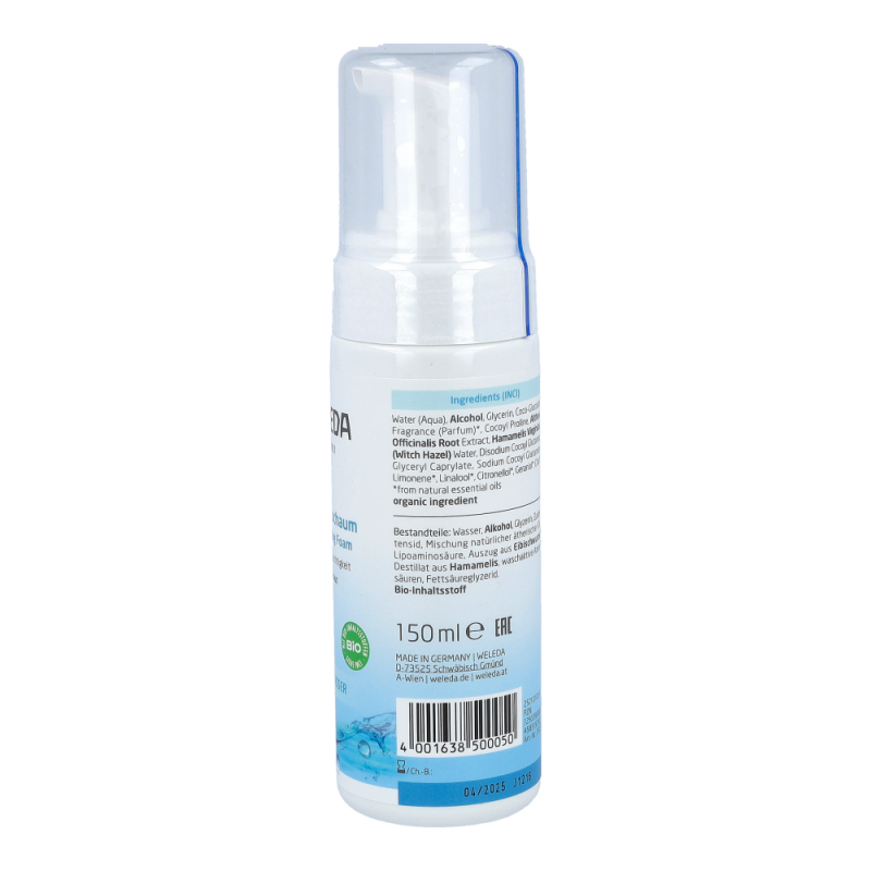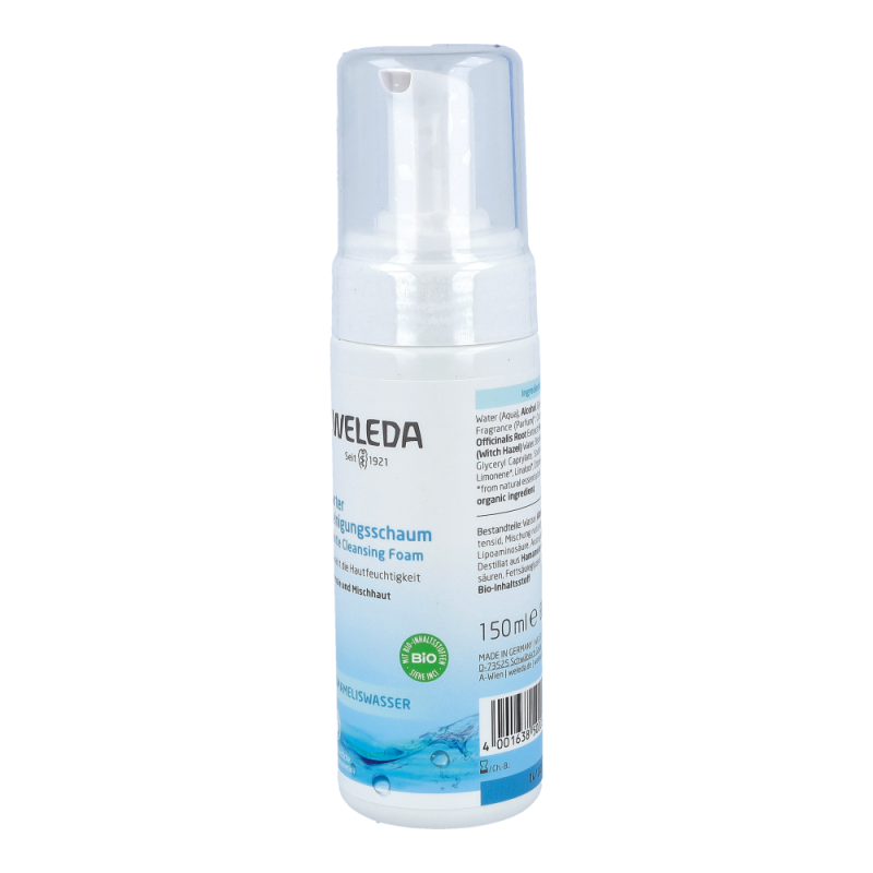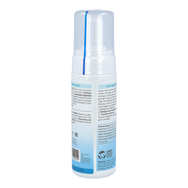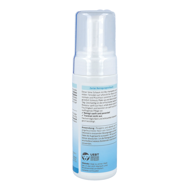 Weleda Zarter Reinigungsschaum reinigt die Gesichtshaut porentief, befreit von Make-up und Überschüssigem Hautfett und erhält die natürliche Feuchtigkeitsbalance der Haut. Die Rezeptur mit Bio-Hamamelis erfrischt die Haut und bereitet sie optimal auf die anschließende Pflege vor