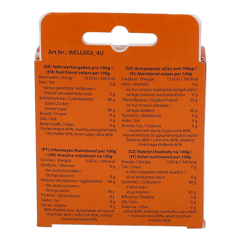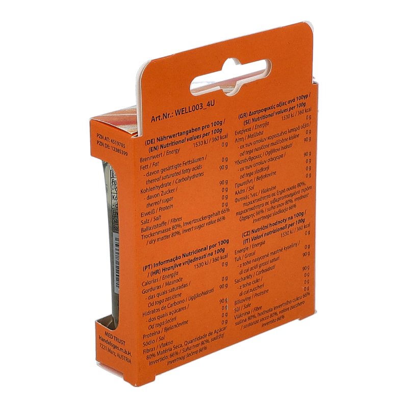 Die Tuben sind durch ihren Drehverschluss leicht zu öffnen und können durch die kleine Größe bequem überall mitgenommen werden. Durch 3 verschiedene Zuckerarten (Glucose, Saccharose, Fructose) gibt der Wellion 1Shot sofort und über längeren Zeitraum Energie.