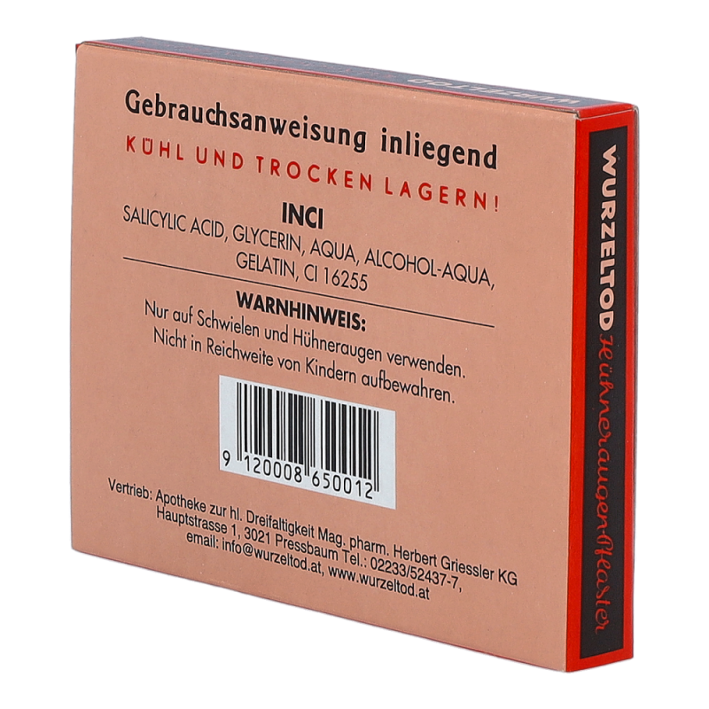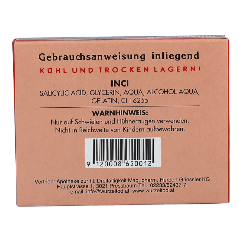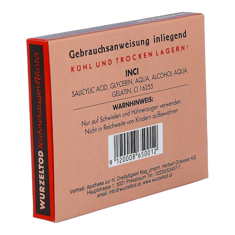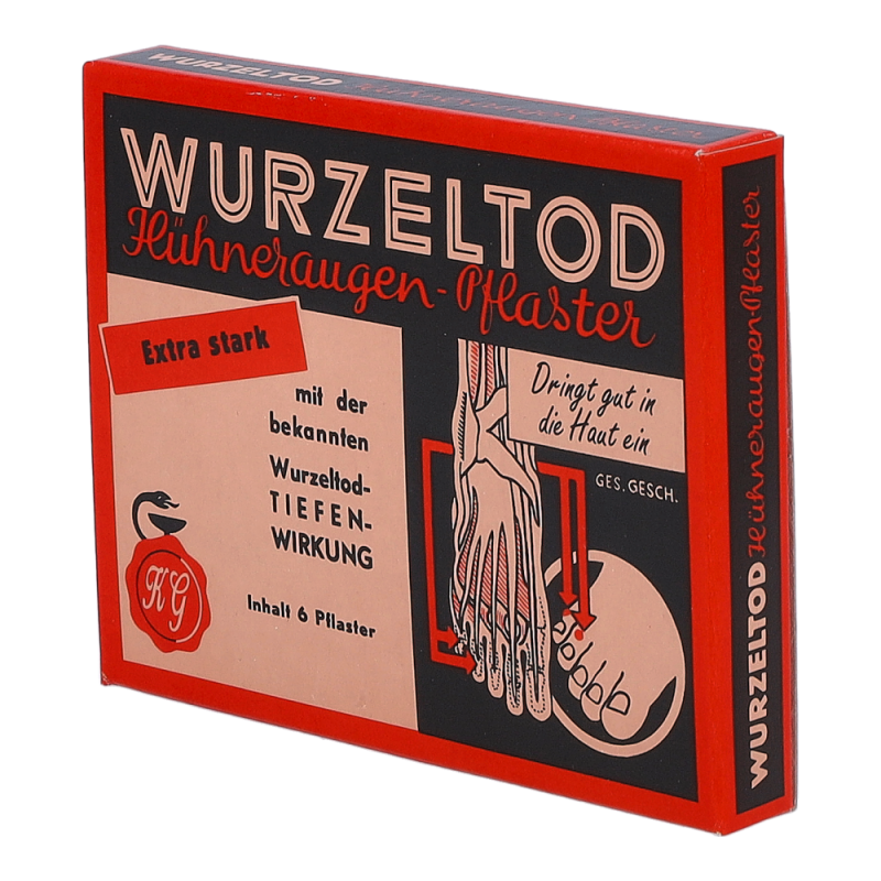 Wurzeltod Hühneraugen Pflaster enthalten den Wirkstoff Salicylsäure, der die Hühneraugen auflöst. Gleichzeitig sorgt die weiche, schaumige Konsistenz der Wirkstoffmasse für eine rasche Linderung des Druckschmerzes.