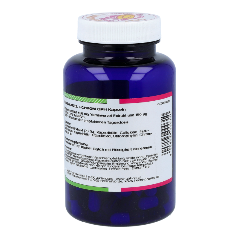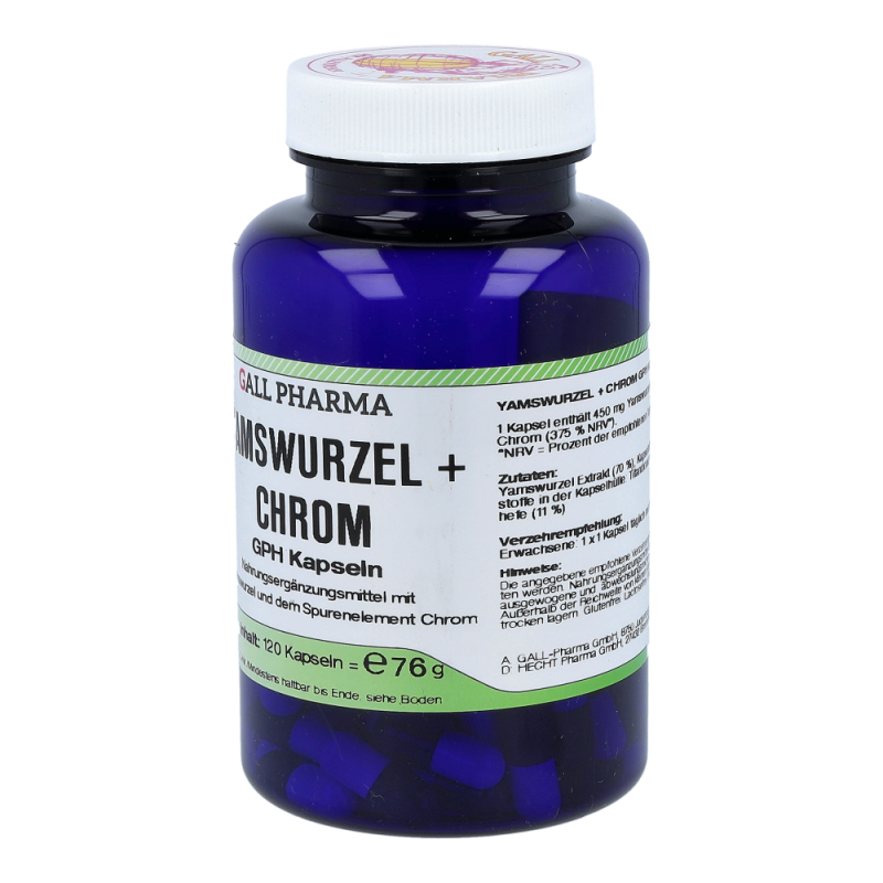 Gall Pharma Yamswurzel plus Chrom Kapseln enthalten 450 mg Yamswurzel-Extrakt mit einem Diosgeningehalt von ca. 8 % und 150 µg Chromhefe in einer Hartgelatinekapsel. Bekannt wurde die Wurzel vor allem durch ihre verjüngende Eigenschaft