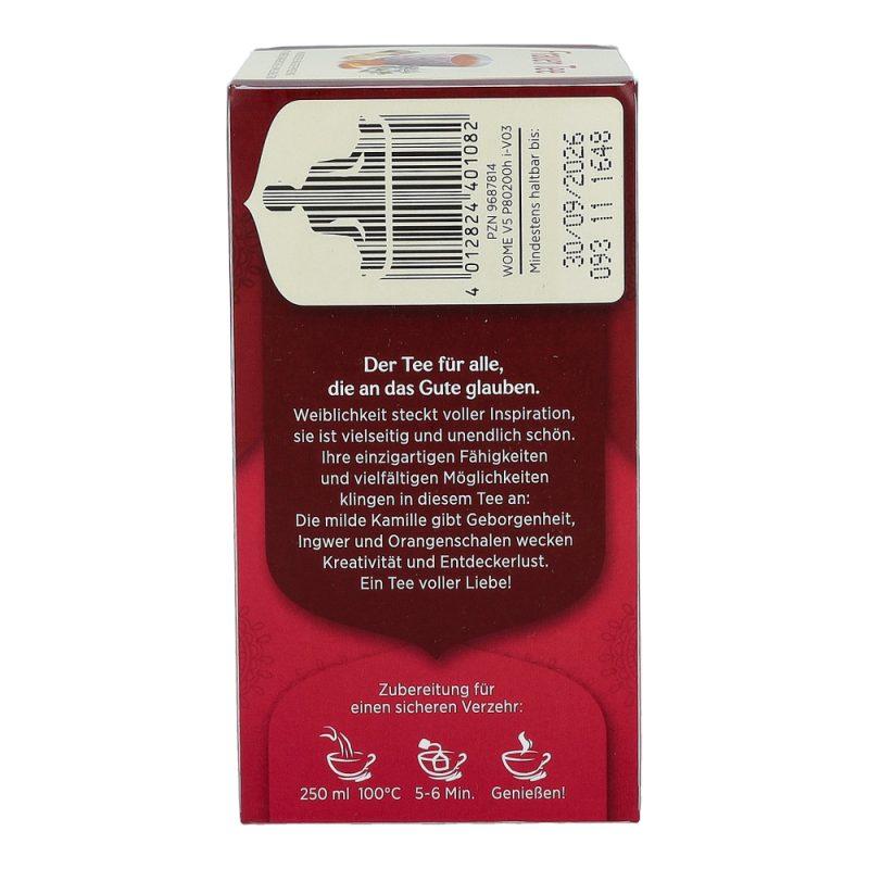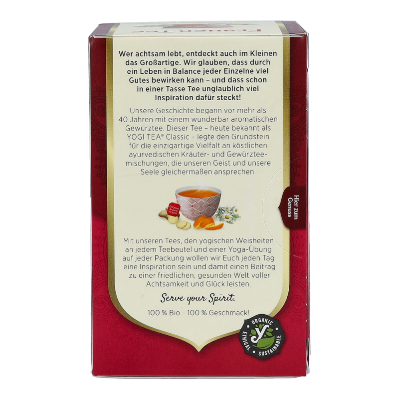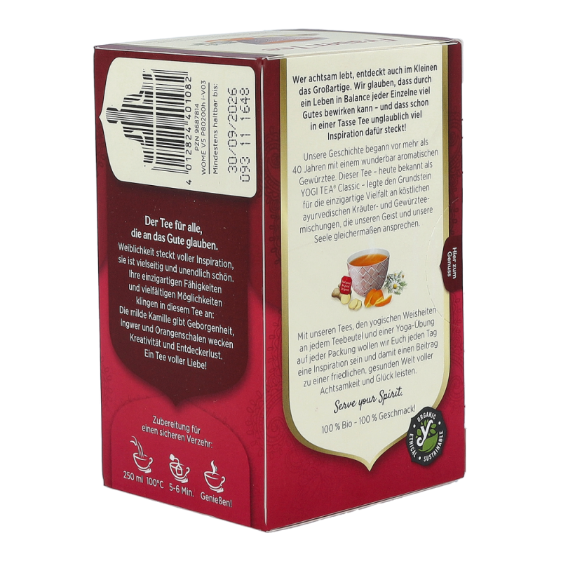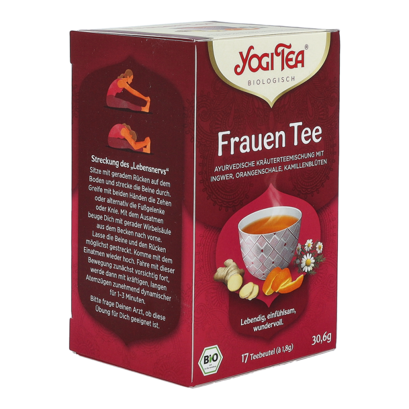 Yogi Tee Frauen Beutel enthält die Gewürze Ingwer, Orangenschalen und Angelikawurzel. Auf diese Gewürze sprechen Frauen in besonderer Weise an und finden dadurch Balance in ihren persönlichen und natürlichen Lebenszyklen.