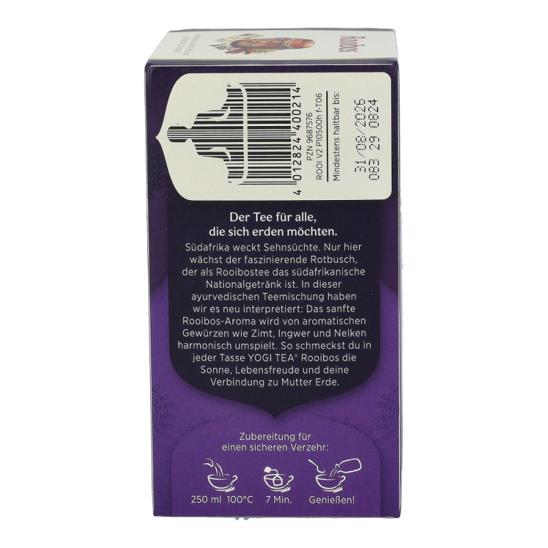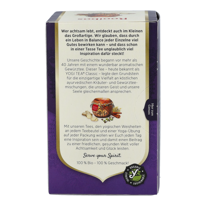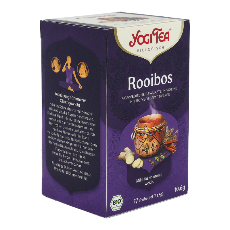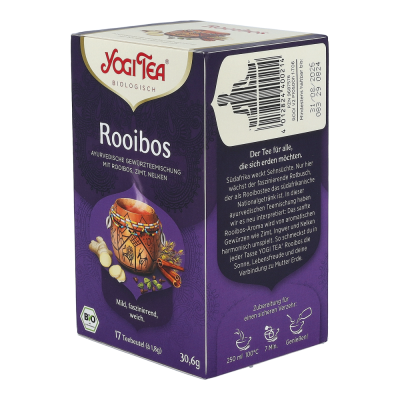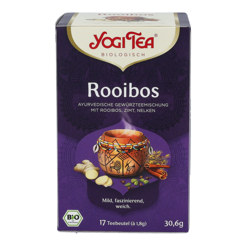 Yogi Tee Rooibos ist voll afrikanischer Folklore. Die leckere Gewürzbeigabe von Zimt, Ingwer, Kardamom und ein wenig schwarzer Pfeffer bringt sein mildes, erdiges Aroma zum Tanzen. Karob und Vanille runden den Geschmack ab.