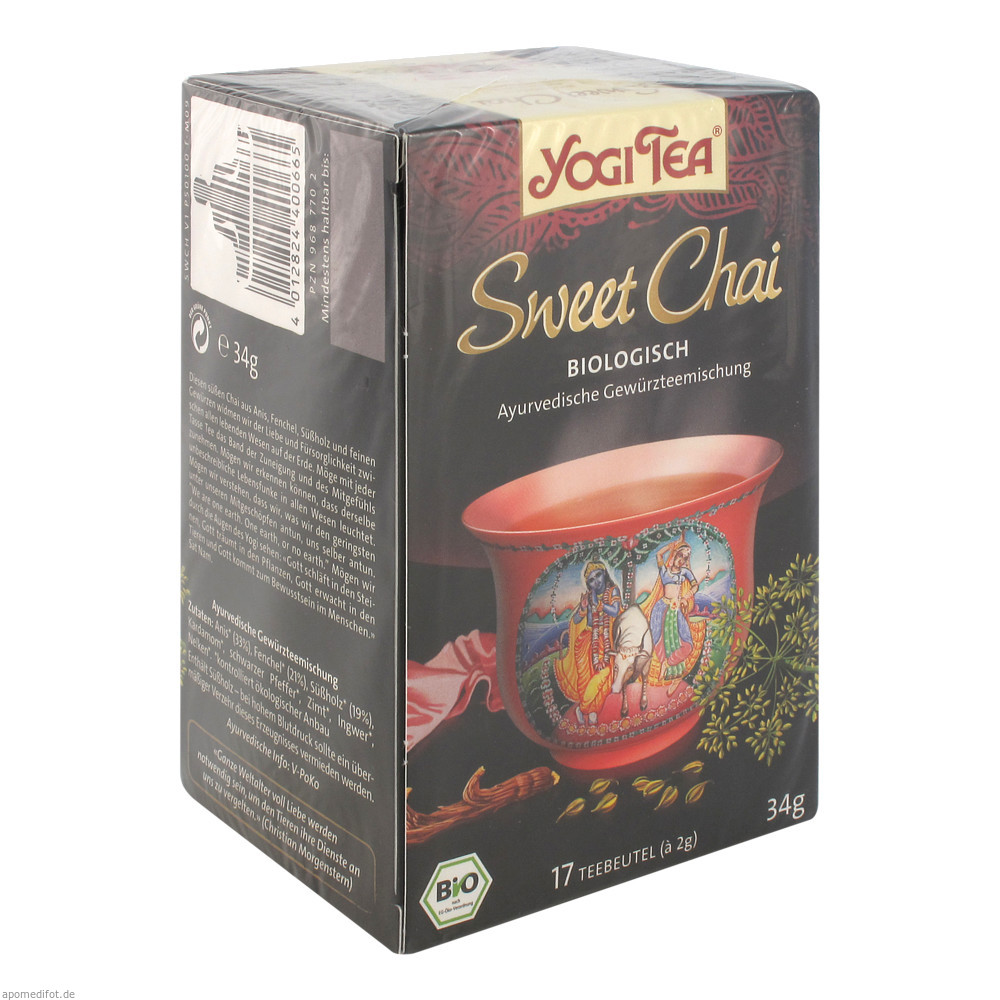 Yogi Tee Sweet Chai ist mit seiner natürlichen Süße von Kräutern und Gewürzen wie Anis, Fenchel, Nelken oder Kardamom ein Tee zum Verlieben. Wenn unsere Bodenhaftung einmal verloren geht, ist Süße besonders bedeutend, da sie das Element Erde repräsentiert.
