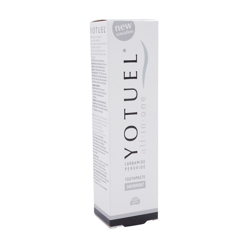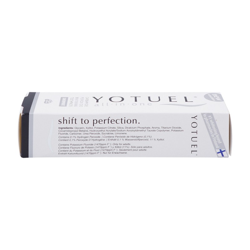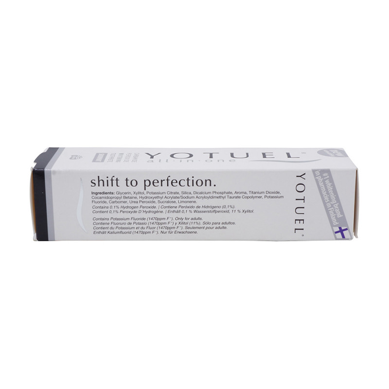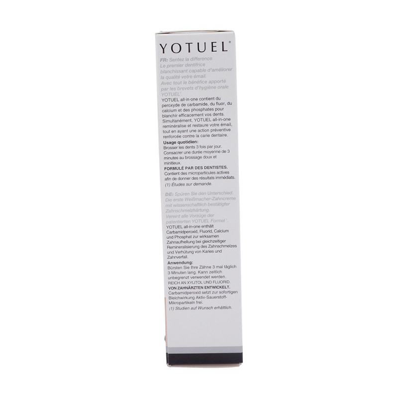 YOTUEL all-in-one ist die erste Weißmacher-Zahncreme mit wissenschaftlich bestätigter Zahnschmelzhärtung. Die Remineralisierung erfolgt durch 100% aktives Fluorid und Phosphat. Keine Schädigung des Weichgewebes der Mundhöhle ( Zahnfleisch und Schleimhäute), da pH-neutral und ohne reizende Tenside. Durch die wasserfreie Formel (im Gegensatz zum Wassergehalt von rund 60% in den üblichen Zahnpasten) ist das Produkt konzentriert und sehr ausgiebig.
