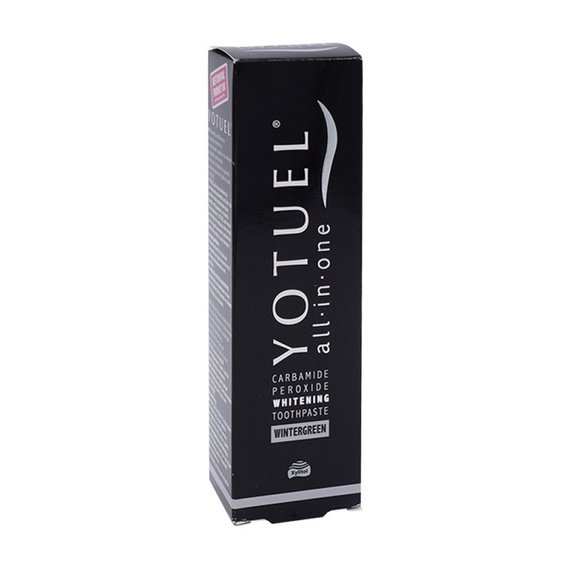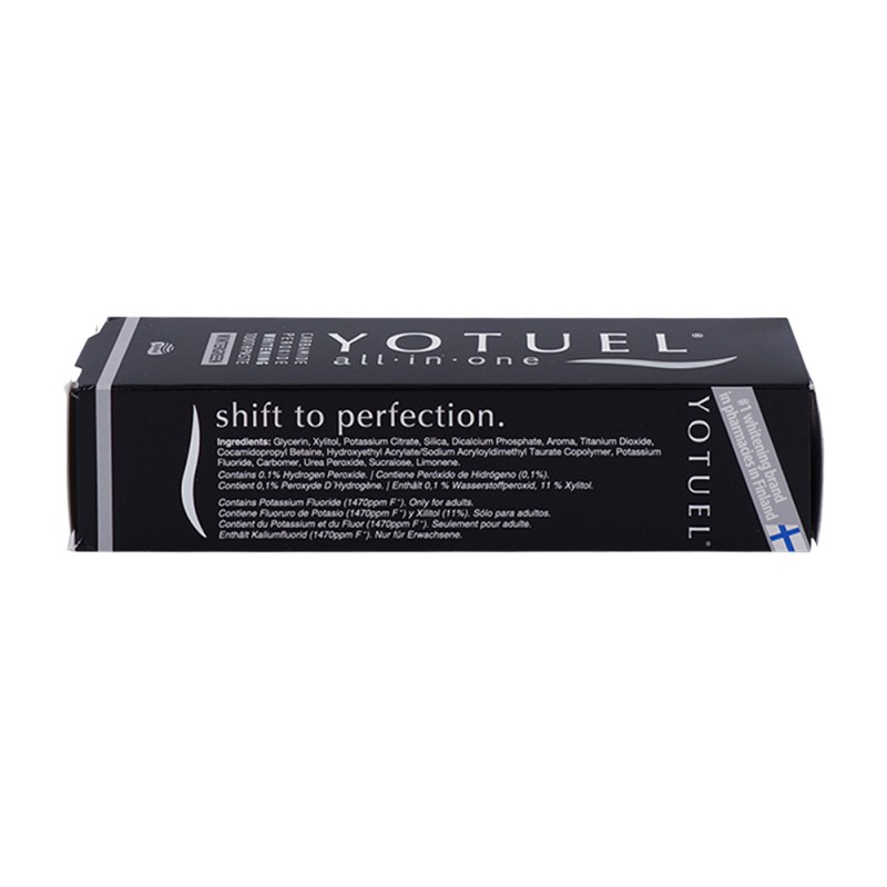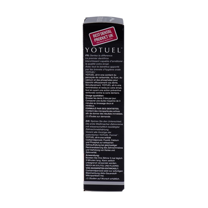 YOTUEL all-in-one ist die erste Weißmacher-Zahncreme mit wissenschaftlich bestätigter Zahnschmelzhärtung. Die Remineralisierung erfolgt durch 100% aktives Fluorid und Phosphat. Keine Schädigung des Weichgewebes der Mundhöhle ( Zahnfleisch und Schleimhäute), da pH-neutral und ohne reizende Tenside. Durch die wasserfreie Formel (im Gegensatz zum Wassergehalt von rund 60% in den üblichen Zahnpasten) ist das Produkt konzentriert und sehr ausgiebig.