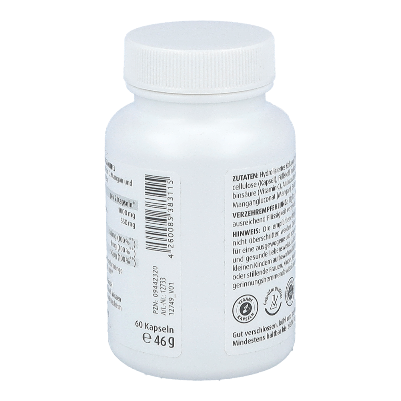 Die Kapseln enthalten das Spurenelement Mangan, das unterstützend für ein gesundes Bindegewebe wirkt. Das in den Kapseln enthaltene Biotin – ein Schönheitsvitamin der Extraklasse – ist für den Körper lebensnotwendig. Die enthaltenen Nährstoffe Vitamin C und Mangan sind ein Zellschutz gegen oxidativen Stress, der für das Voranschreiten des Hautalterungsprozesses mit verantwortlich ist.