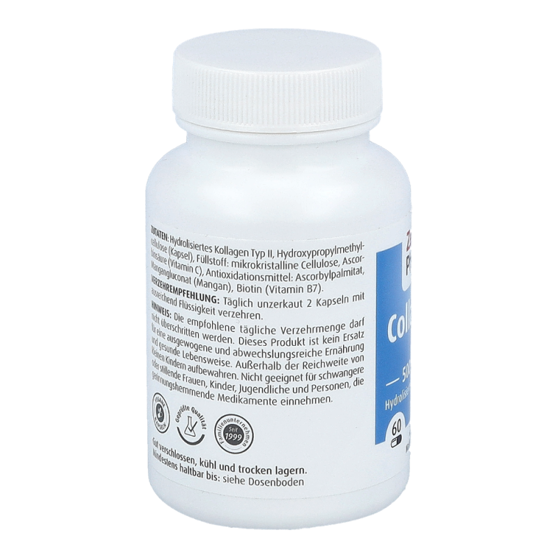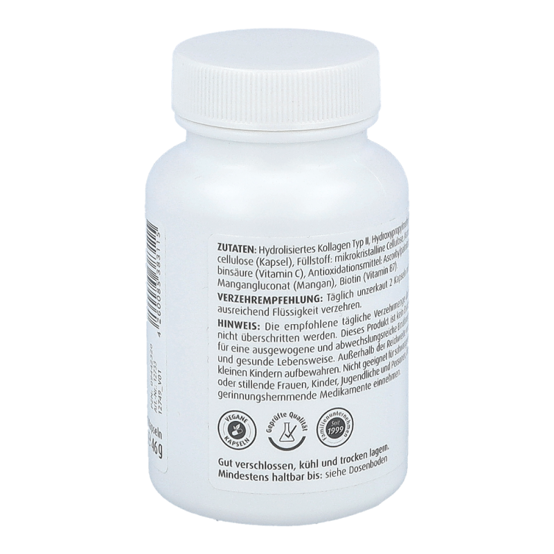 Eine Packung mit 60 Kapseln, von denen 1 Kapsel je 500 mg BioCell Collagen® enthält, reicht für einen Monat. Der patentierte Rohstoff enthält