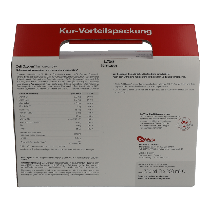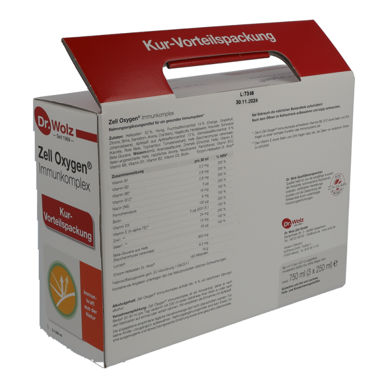 Zell oxygen Trituration Immunkomplex ist Kombipräparat mit erstklassigen bioaktiven Substanzen, Vitaminen und Spurenelementen. Die hochwertigen Antioxidatien stammen aus ausgewählten Obst- und Gemüsekonzentraten. Erhältlich in den Varianten 250ml und 750ml.